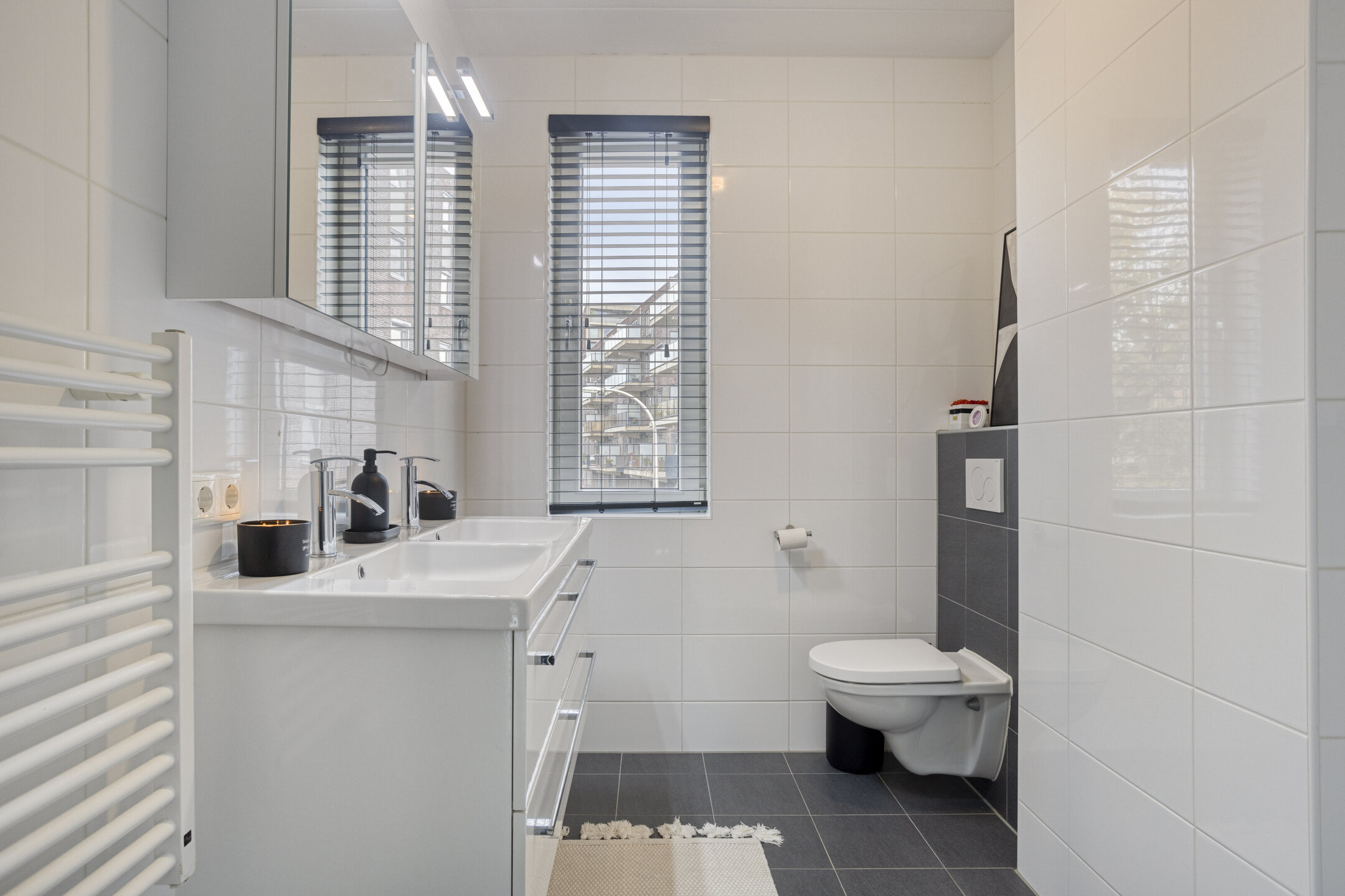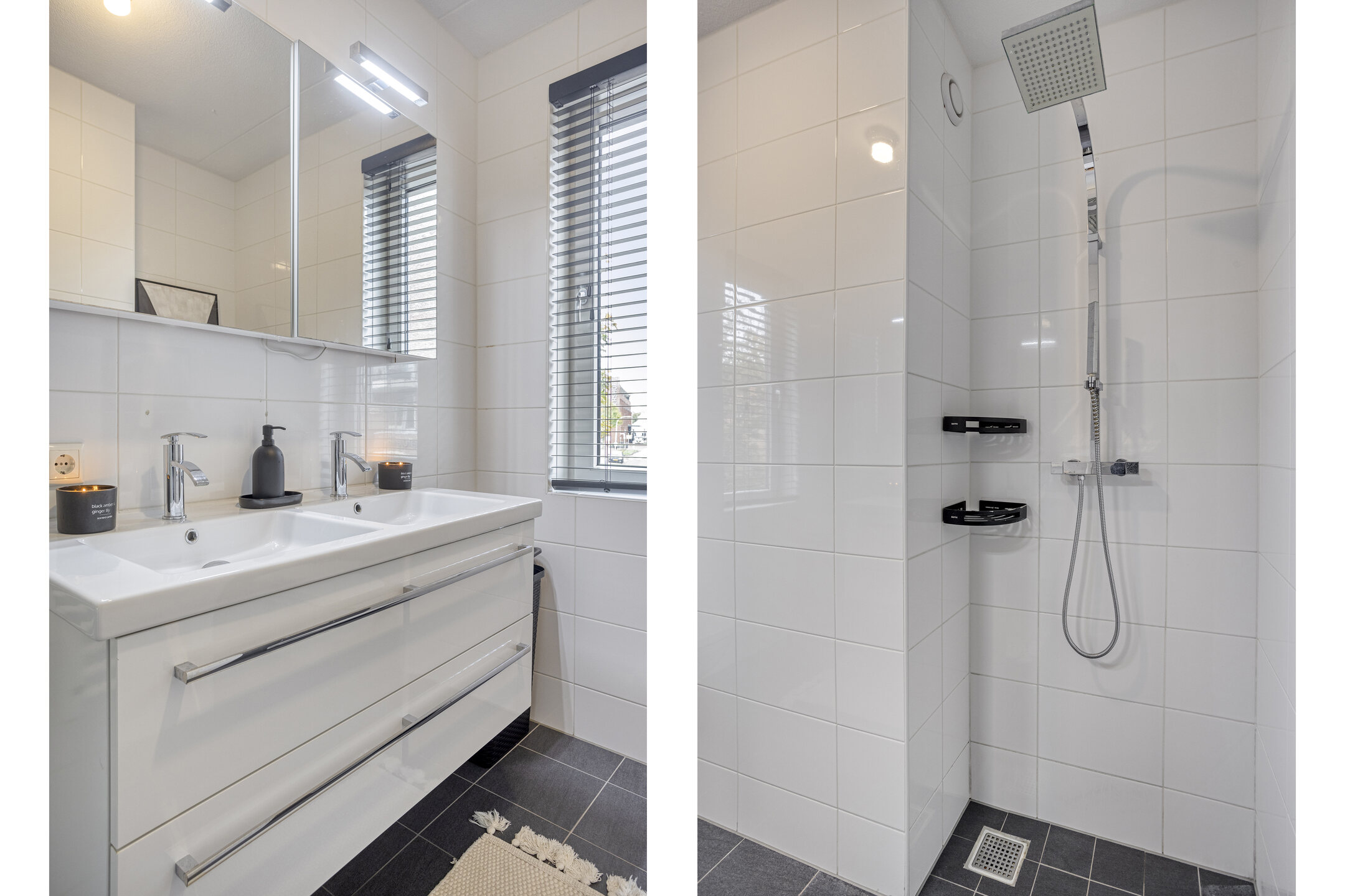 De moderne badkamer is compleet uitgevoerd met inloopdouche, tweede toilet, dubbele wastafel met meubel en handdoekradiator.