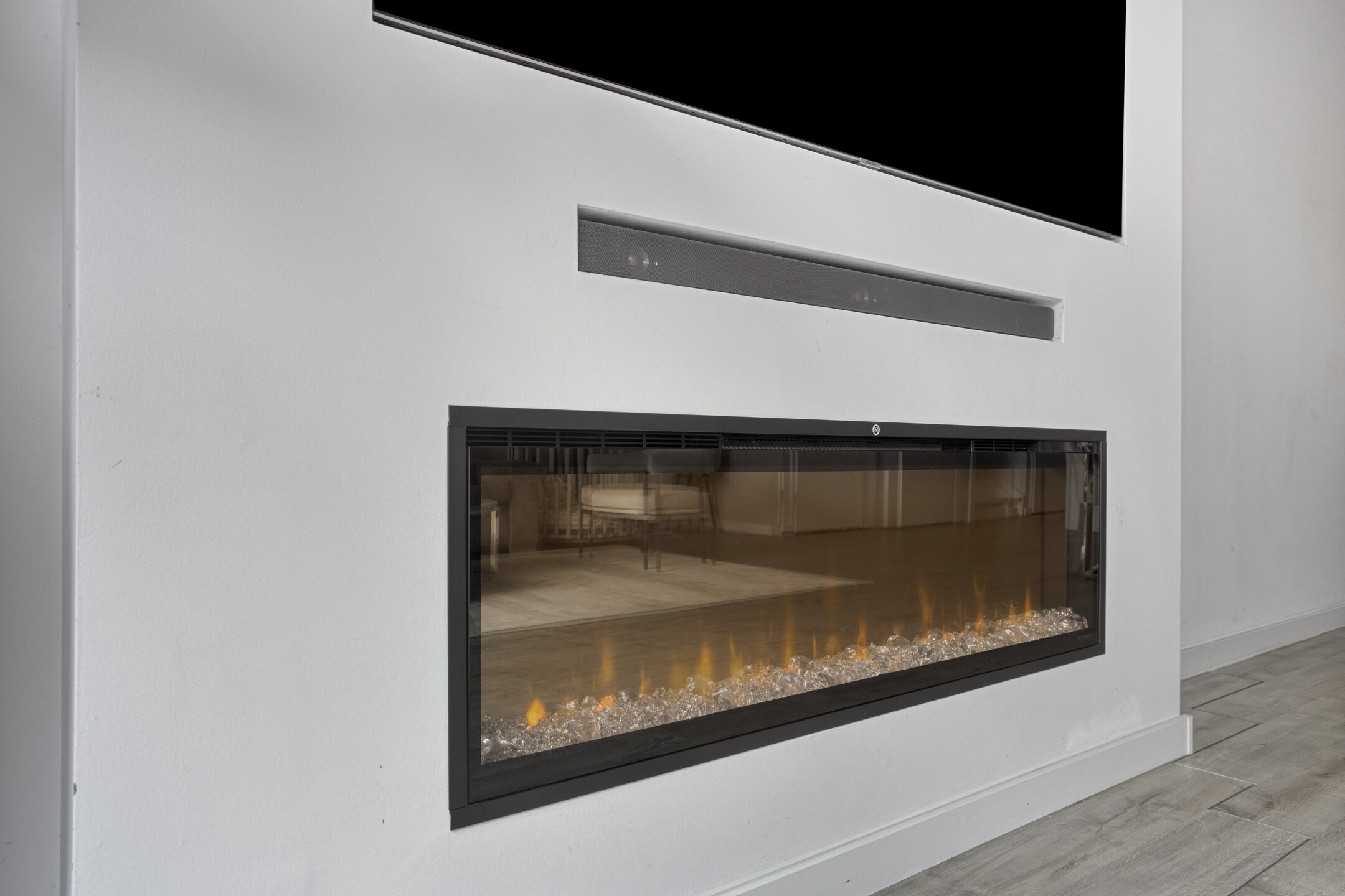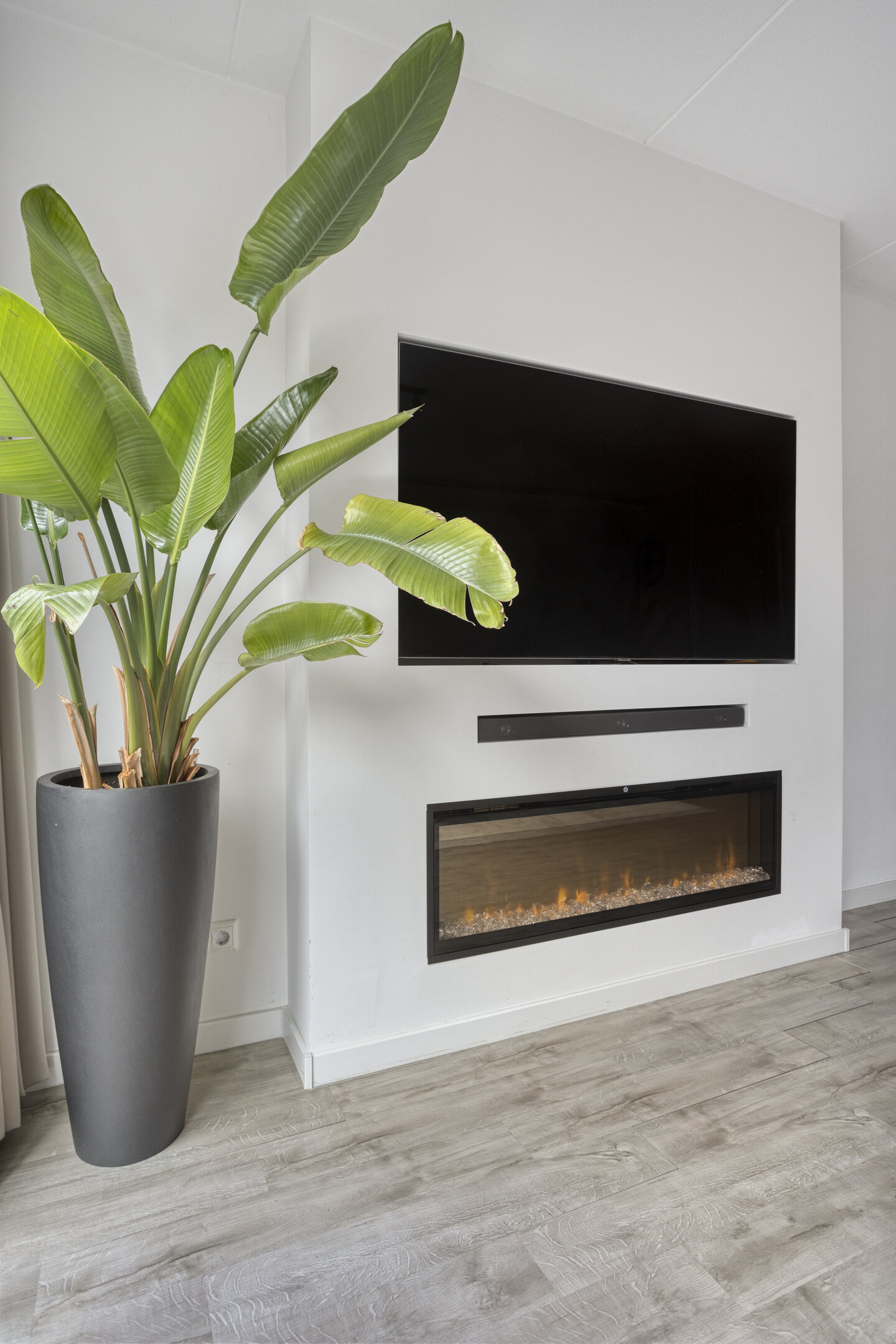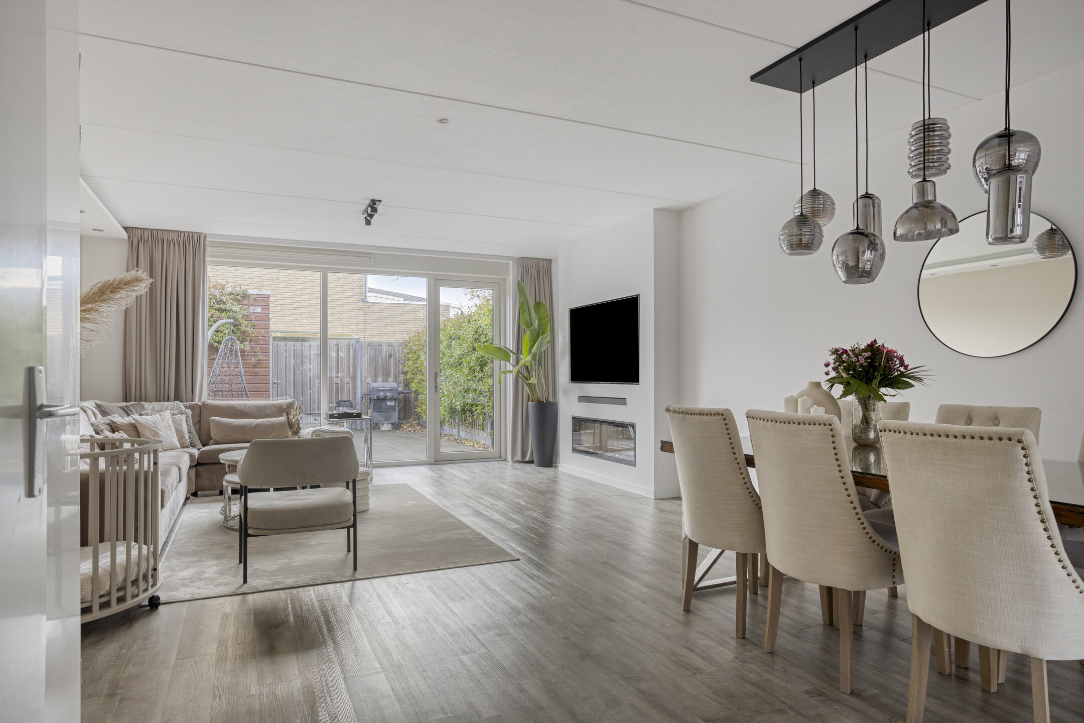 De ruime woonkamer met royale uitbouw is voorzien van een moderne PVC-vloer met vloerverwarming en een stijlvolle cinemawall met sfeervolle elektrische haard.