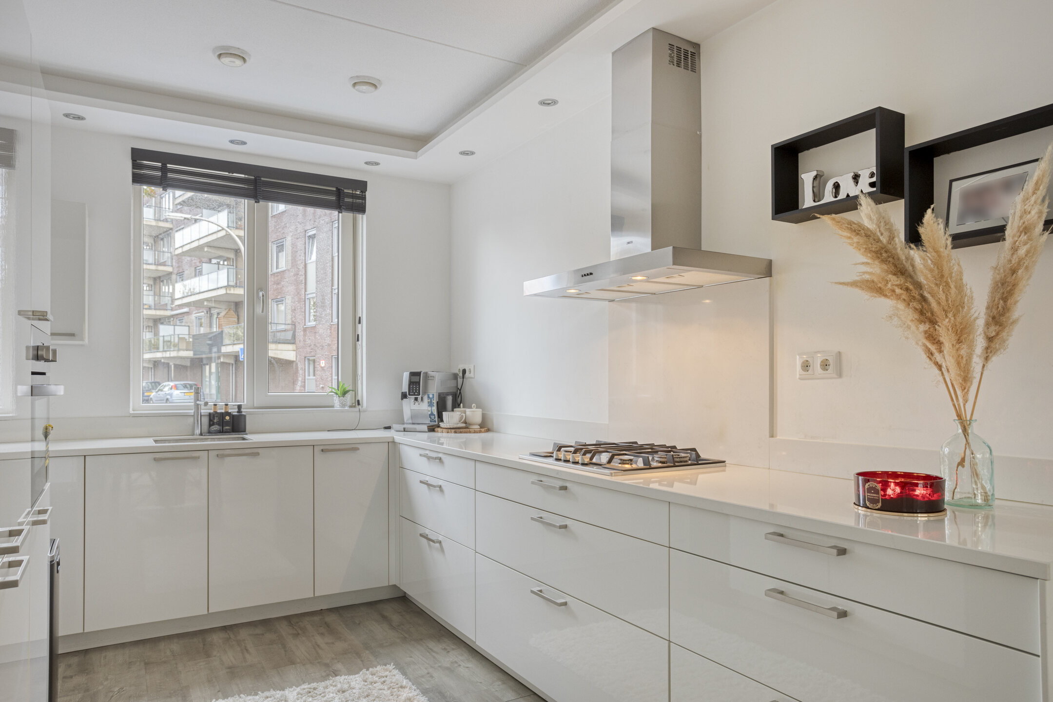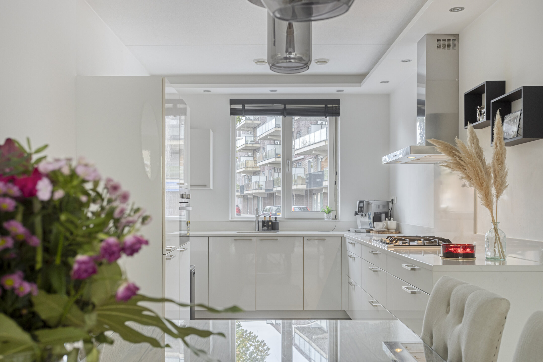 Aan de voorzijde bevindt zich de moderne keuken in hoekopstelling, uitgerust met diverse inbouwapparatuur waaronder een gasfornuis, afzuigkap, combi-oven, vaatwasser en koel-vriescombinatie. Er is bovendien volop kastruimte aanwezig.