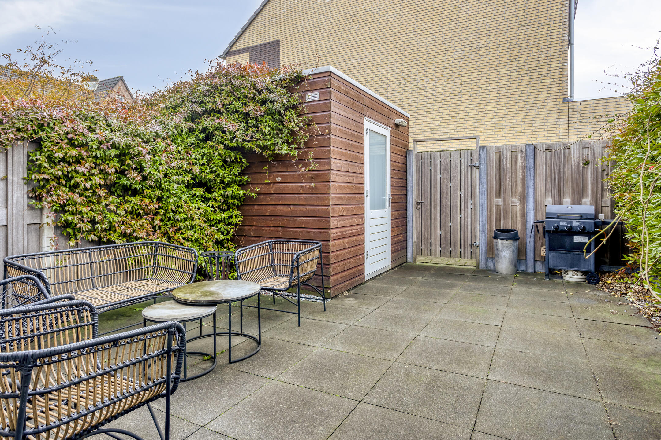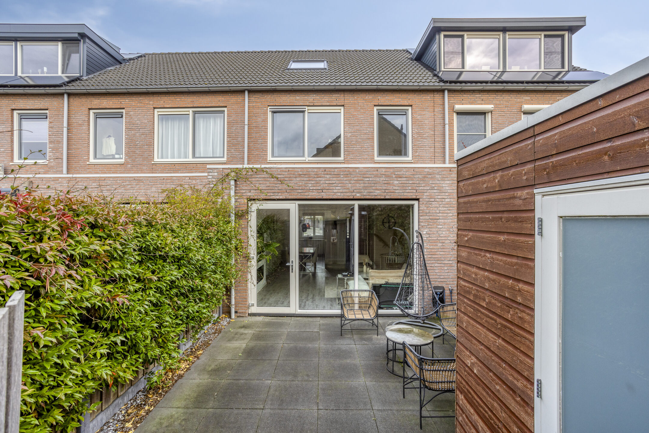 De zonnige tuin is keurig aangelegd met fraaie bestrating en beschikt over een berging. Achter de tuin ligt een mandelig terrein met een eigen parkeerplaats die bij de woning hoort.