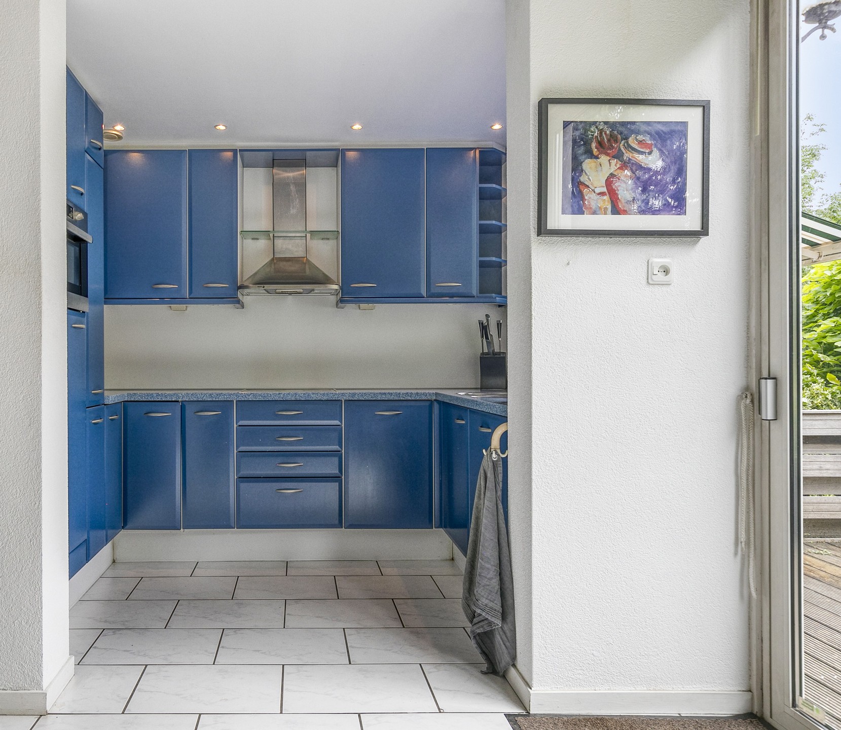 Aan de achterzijde bevindt zich de open keuken, compleet uitgerust met een vaatwasser, combi-magnetron, koelkast, keramische kookplaat, afzuigkap en een spoelbak met mengkraan.