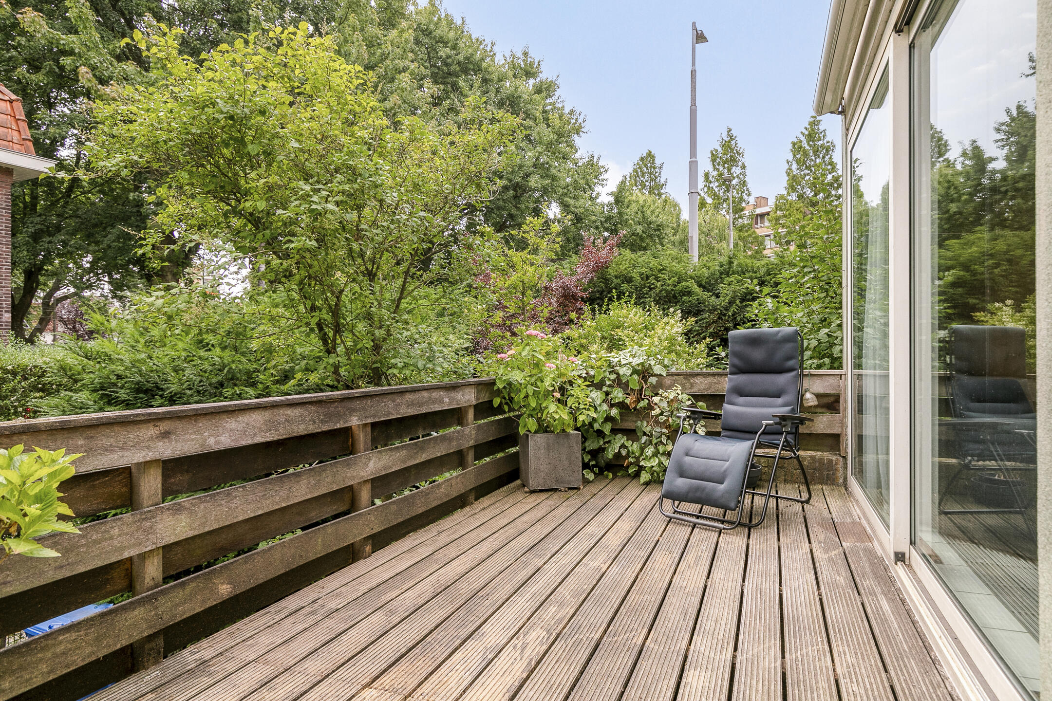 Via de kunststof schuifpui kom je op het zonnige terras, dat is voorzien van een elektrisch zonnescherm. Vanuit hier leidt een trap naar de lager gelegen achtertuin op het oosten, die samen met de tuin rondom de woning zorgt voor veel buitenruimte, zon en privacy.