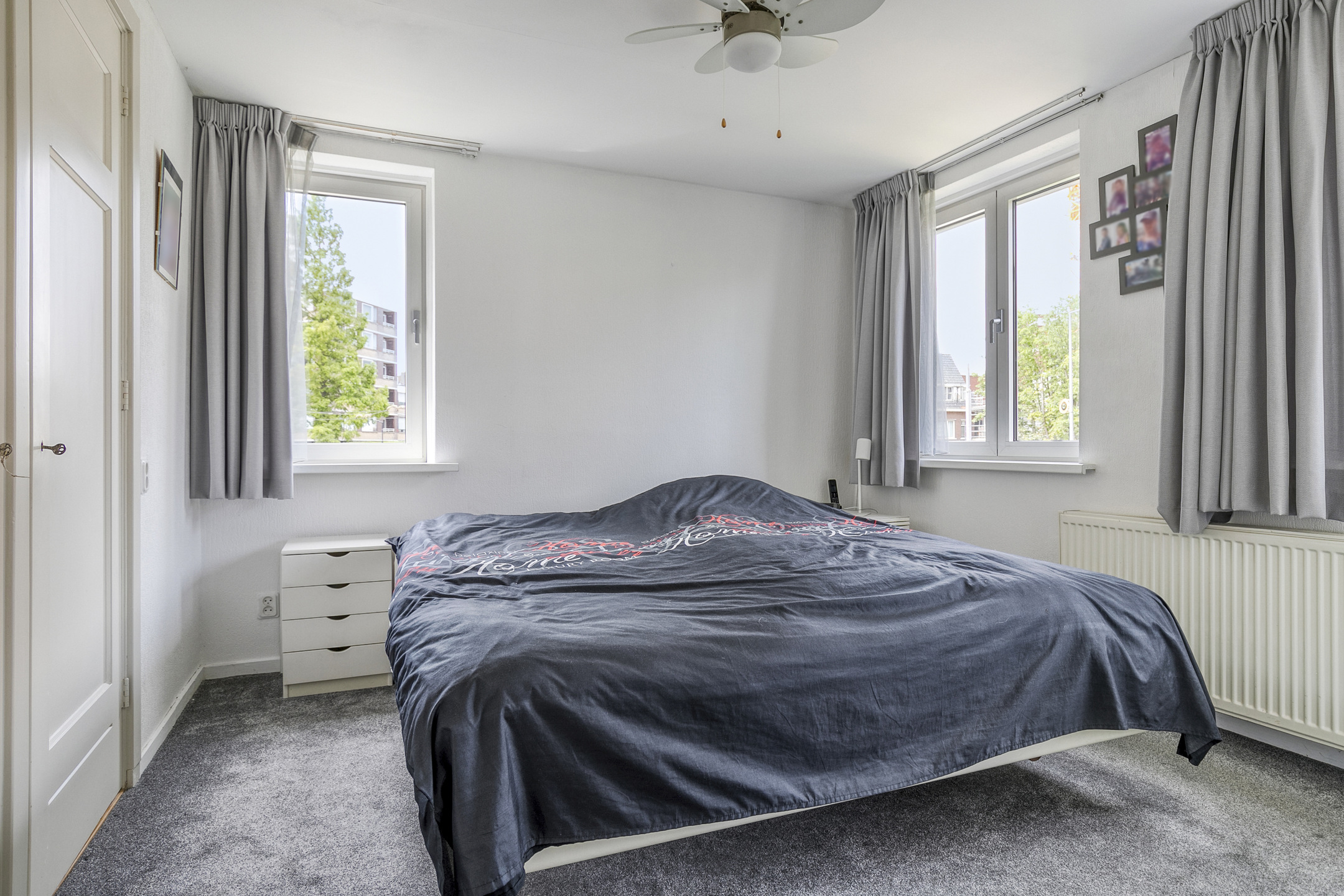 Slaapkamer 1 aan de voorzijde is een royale ouderslaapkamer met vaste kasten en een elektrisch zonnescherm.