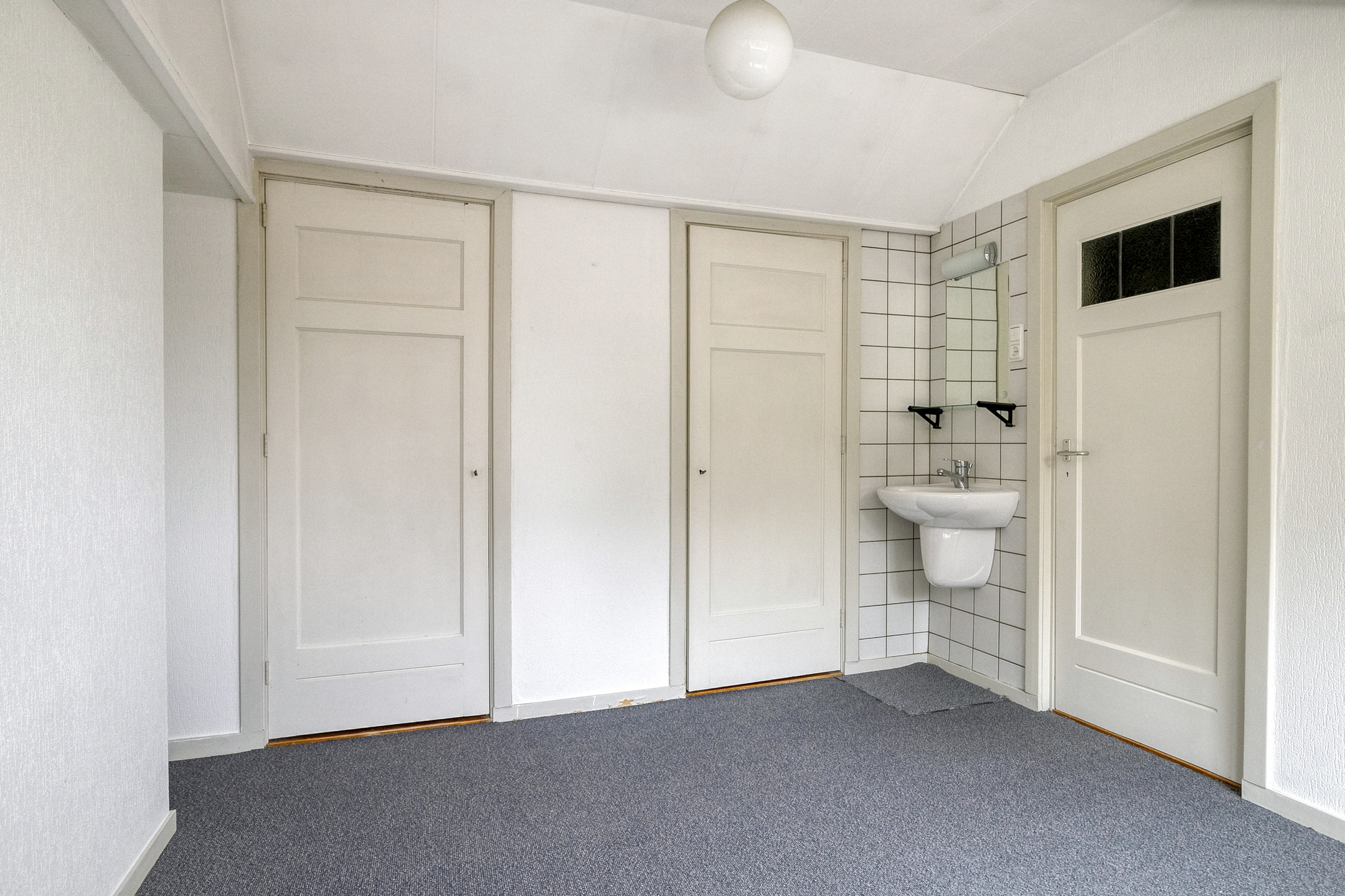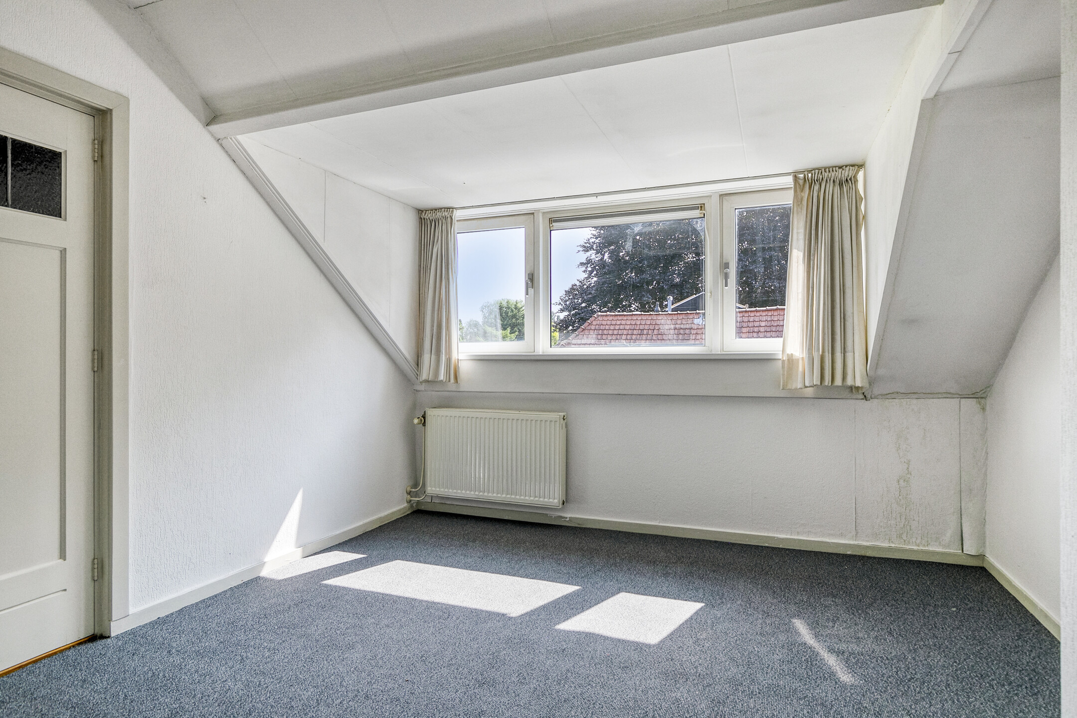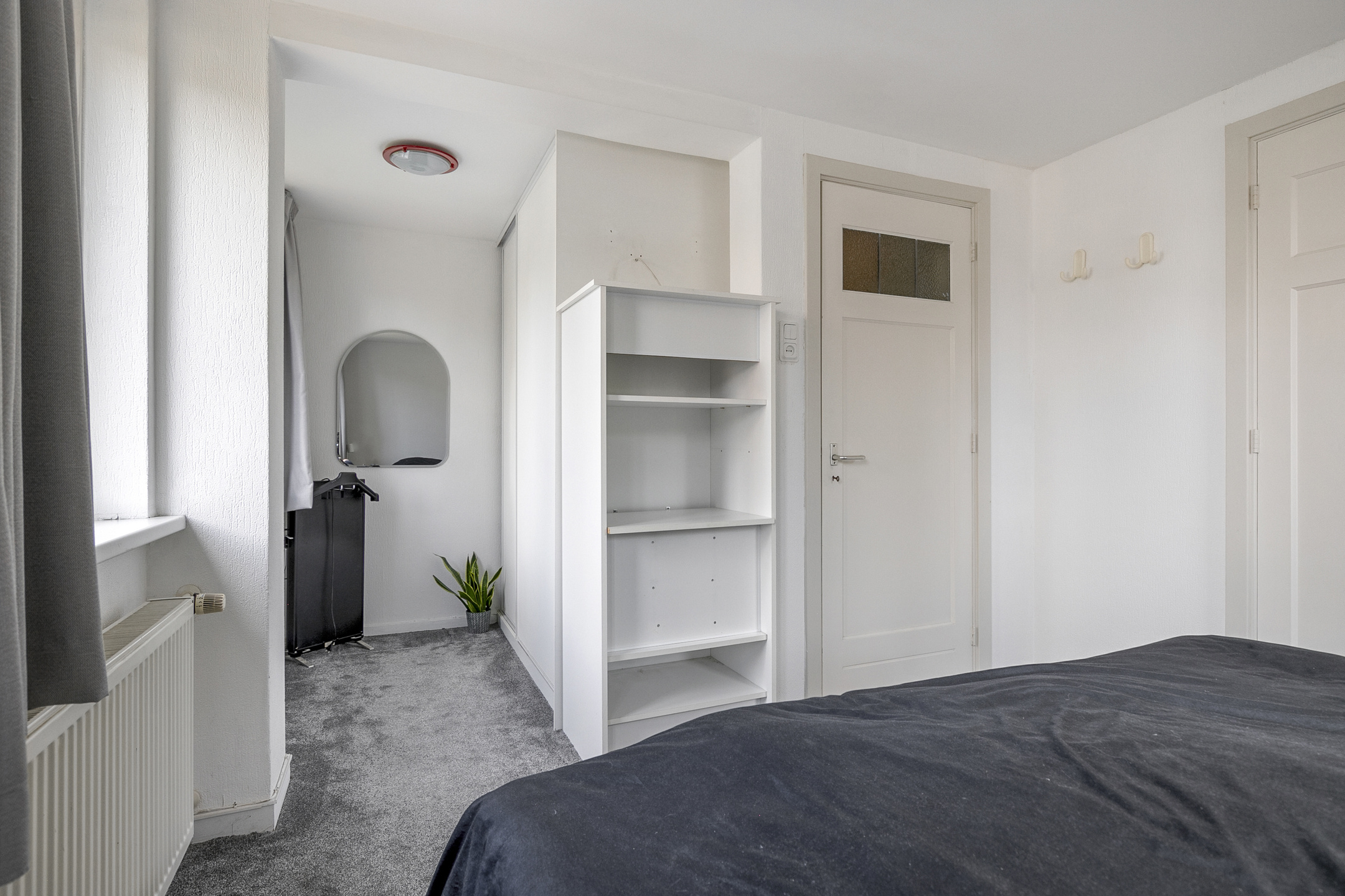 Overloop met twee ruime vaste opbergkasten, waarvan één in gebruik is als opstelruimte voor de cv-installatie (lease). De slaapkamer op zolder is voorzien van een dakkapel met dubbele beglazing, wastafel en vaste kasten.