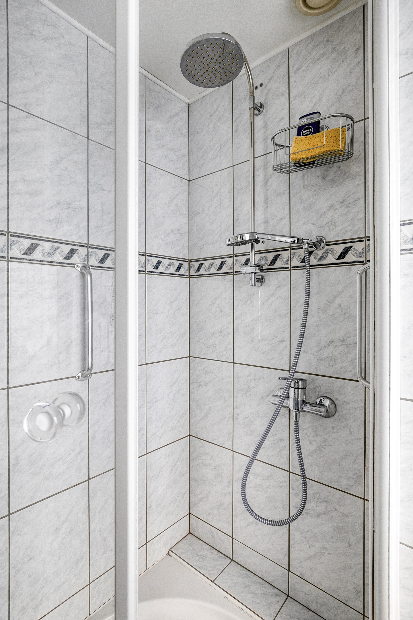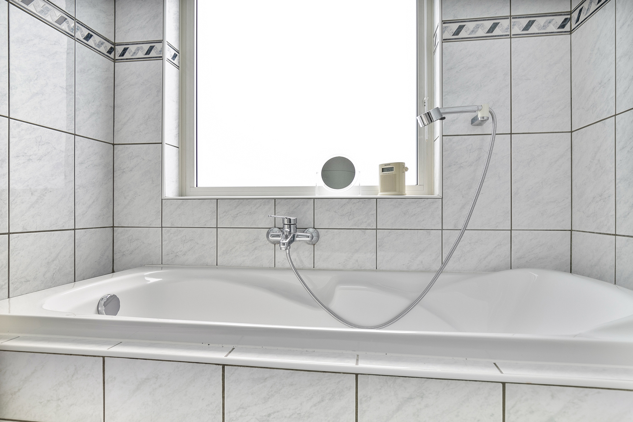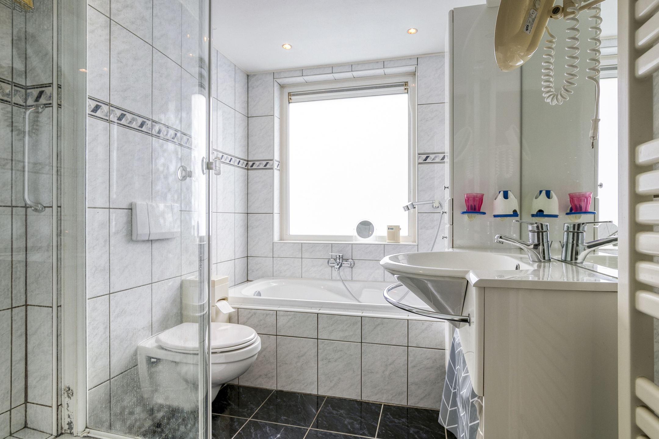 De badkamer is compleet uitgerust met een douche, ligbad, wastafelmeubel, toilet en een handdoekradiator.