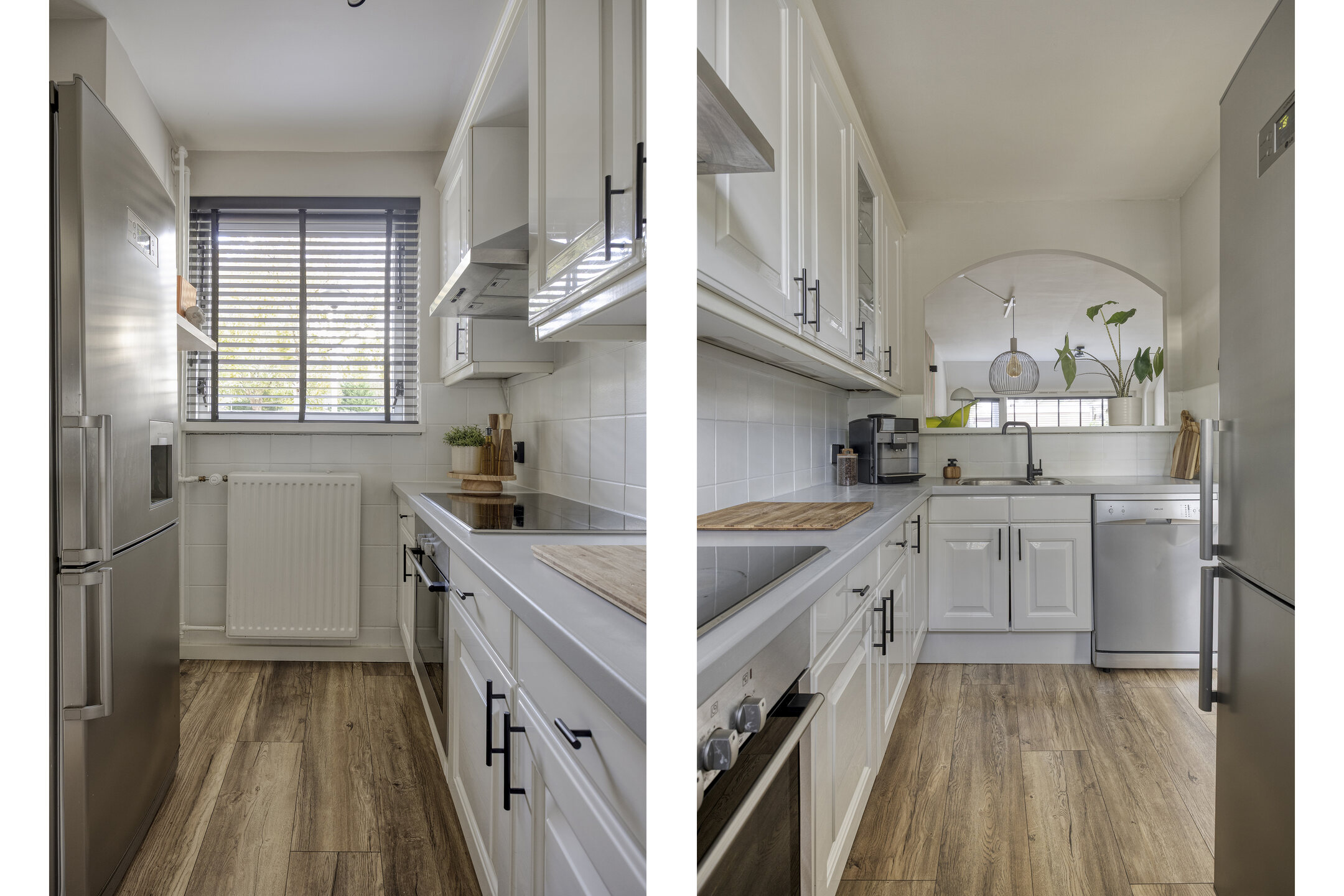 De keuken in L-opstelling bevindt zich aan de voorzijde van de woning en is uitgerust met een keramische kookplaat, oven, afzuigkap, koel-vriescombinatie, vaatwasser en een spoelbak met mengkraan.