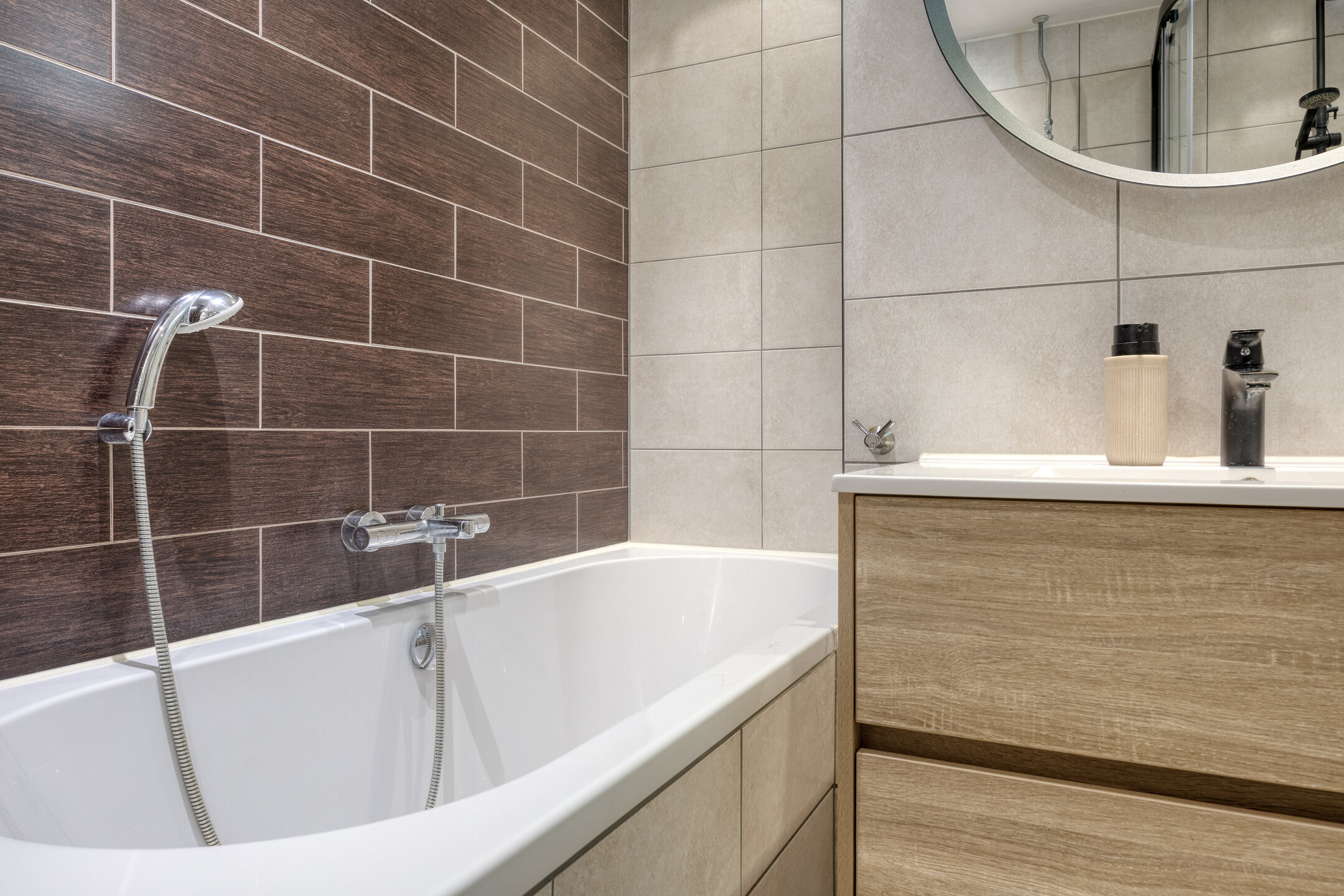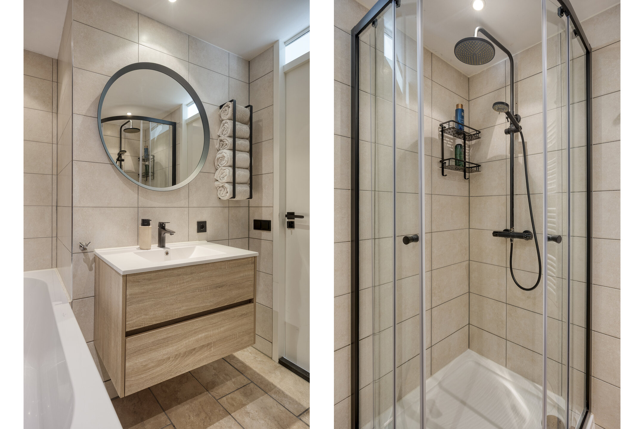 De badkamer is voorzien van een ligbad, douche, wastafel, toilet, handdoekradiator en mechanische ventilatie.