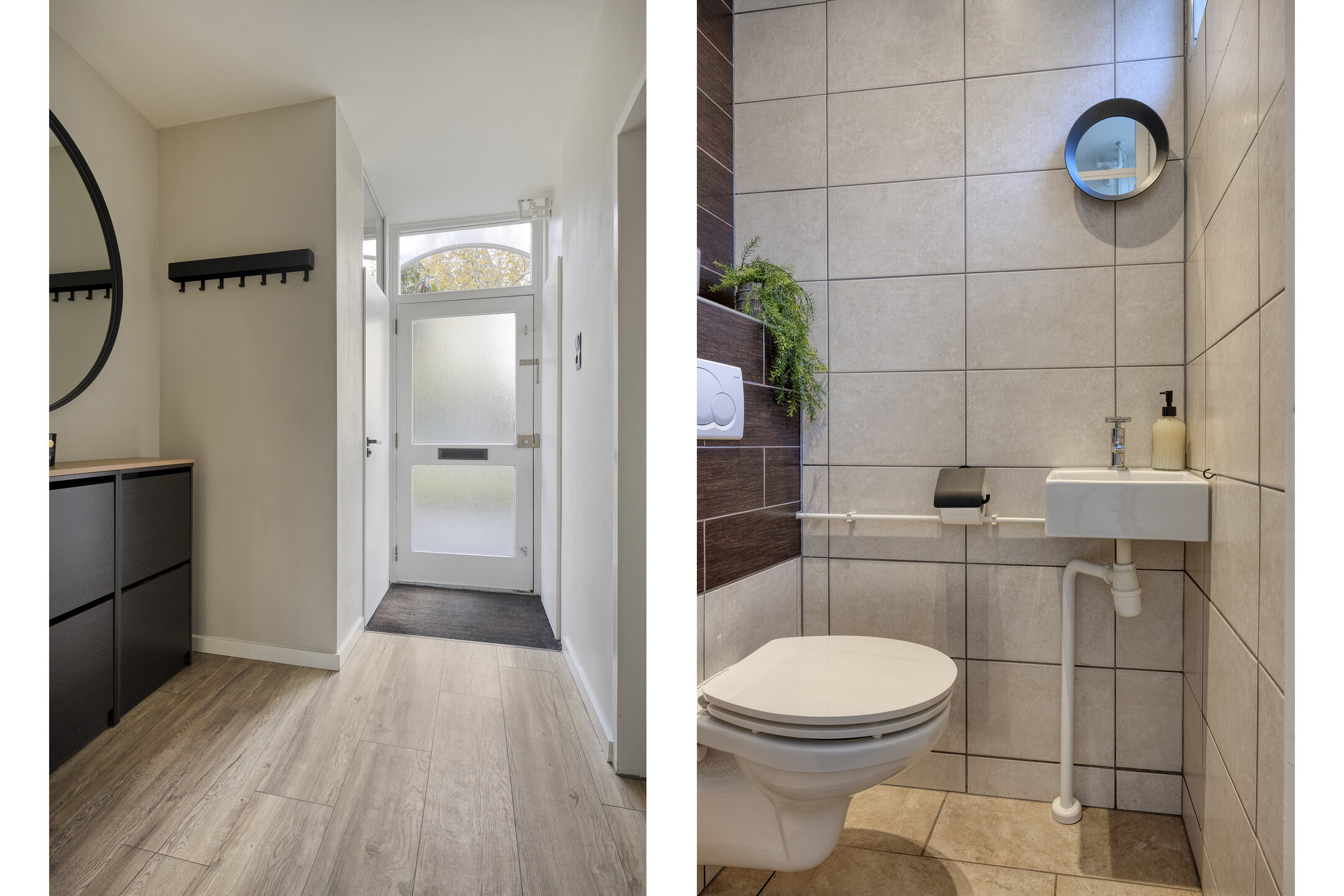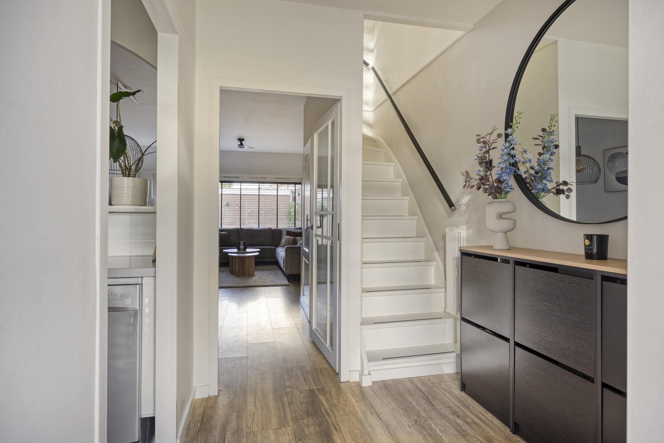 Entree, hal met meterkast, toilet, trapopgang naar de eerste verdieping en toegang tot de keuken en woonkamer.