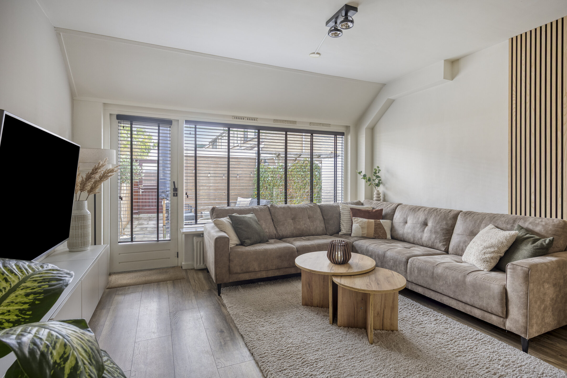 De verrassend ruime, tuingerichte woonkamer is voorzien van een mooie laminaatvloer en heeft toegang tot de zonnige achtertuin. Daarnaast is er een praktische trapkast aanwezig.