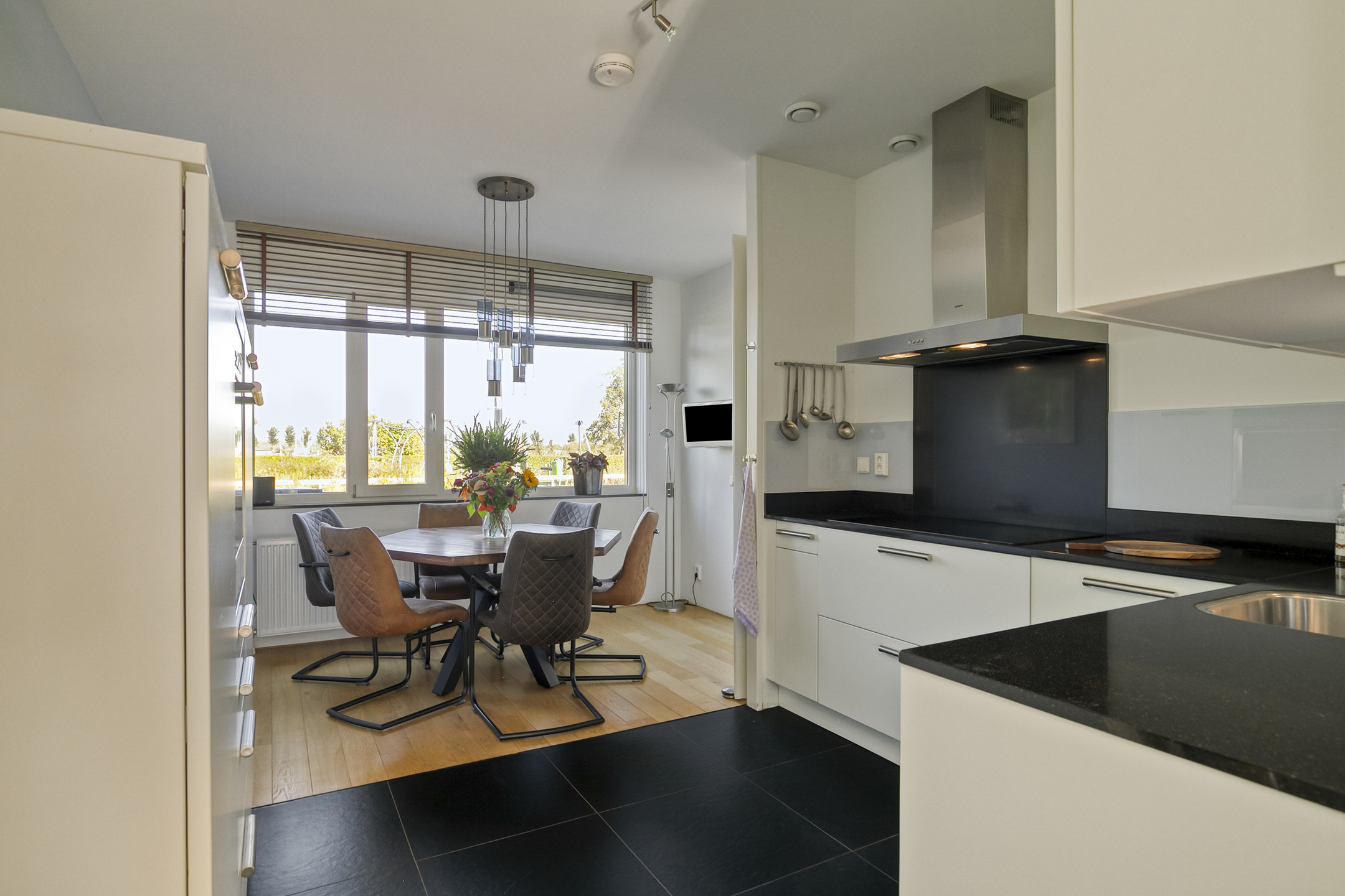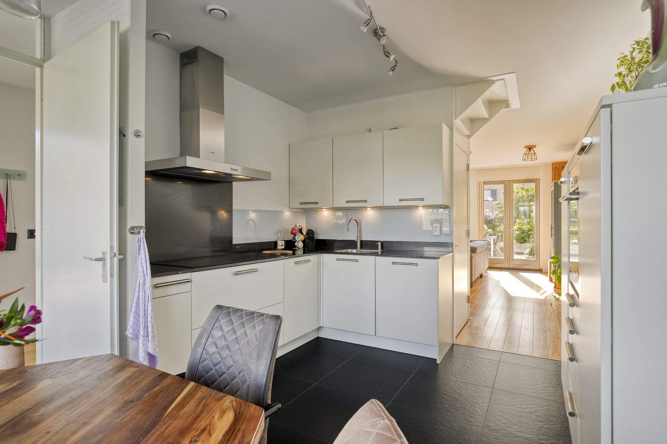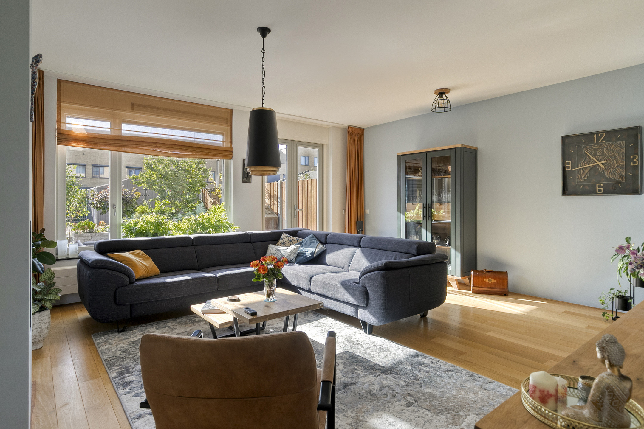 De sfeervolle woonkamer is gelegen aan de achterzijde en voorzien van een houten parketvloer en een gezellige gashaard. Onder de trap bevindt zich een praktische trapkast. Aan de voorzijde vind je de eethoek en de nette L-vormige keuken, uitgerust met inductiekookplaat, afzuigkap, vaatwasser, Quooker met dispenser, koelkast, vriezer en een combi-oven.
