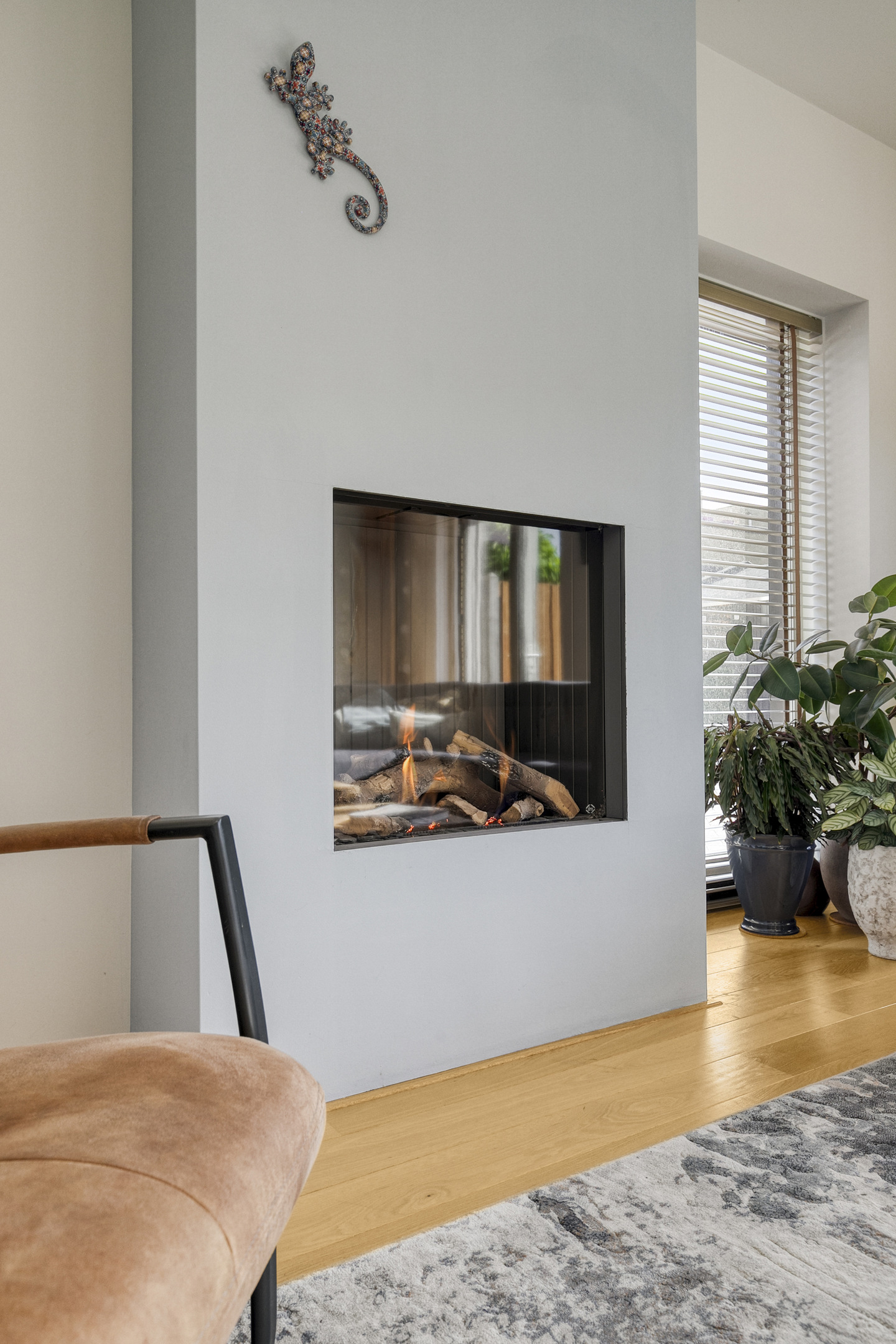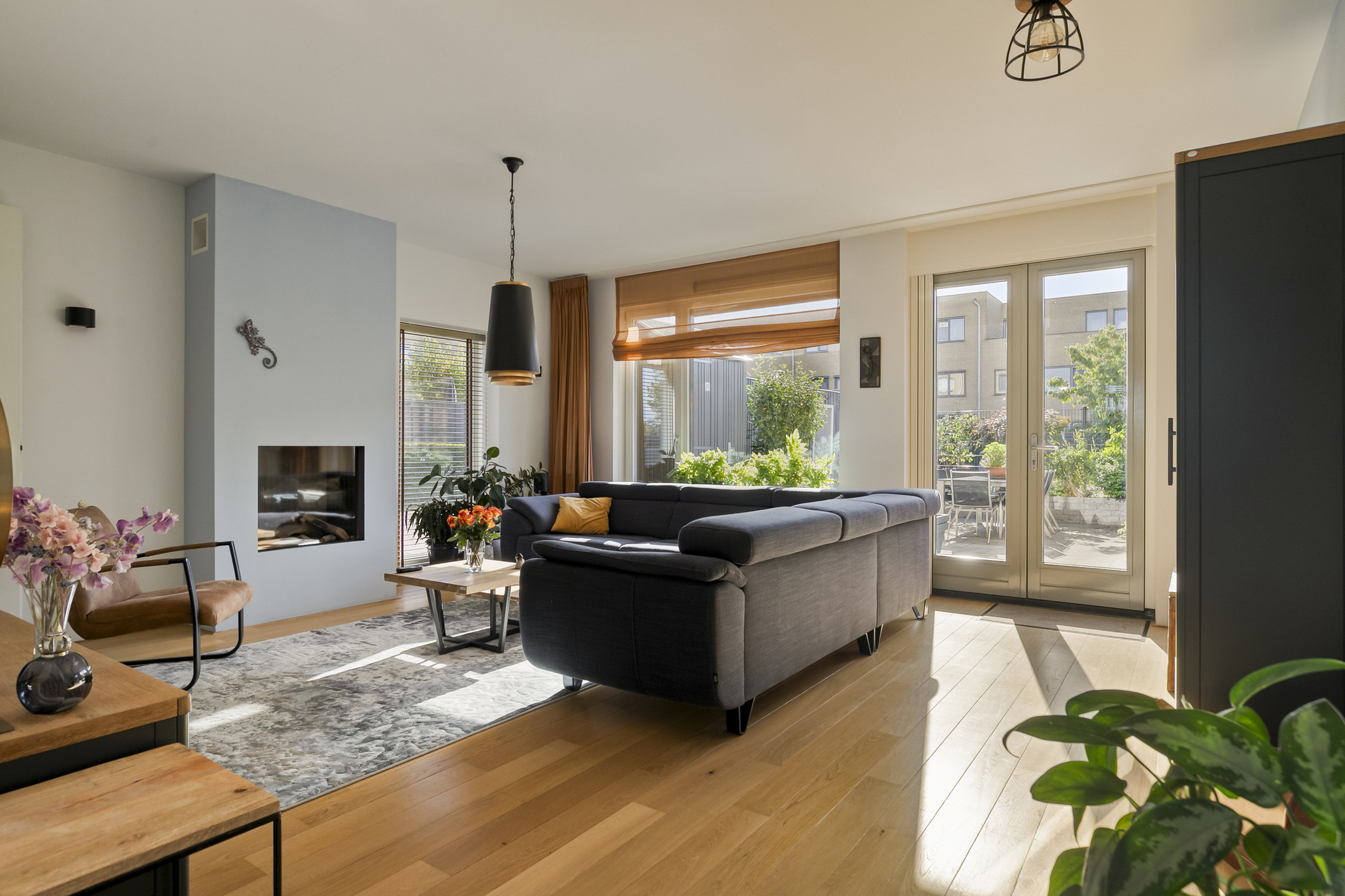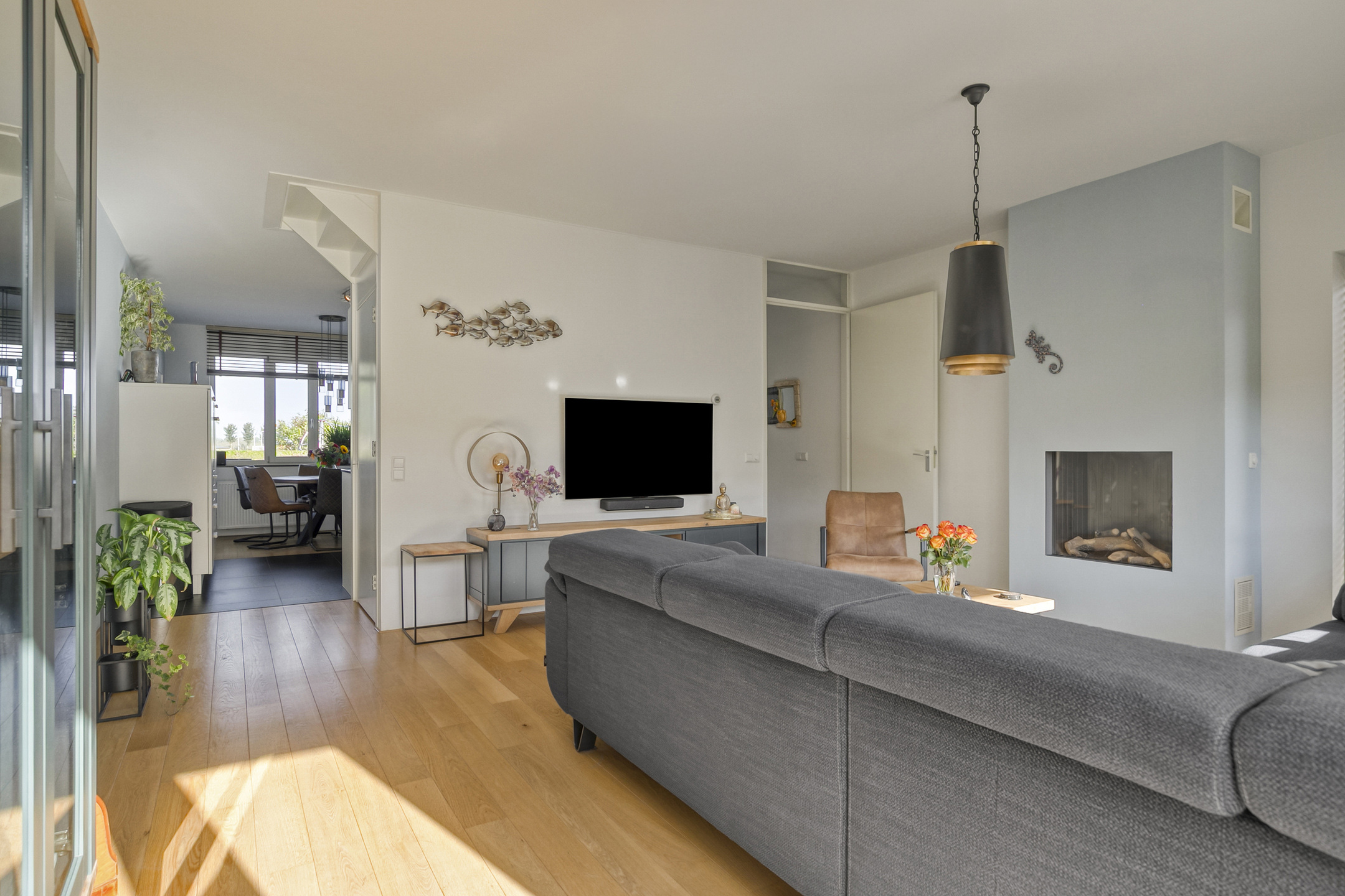 De sfeervolle woonkamer is gelegen aan de achterzijde en voorzien van een houten parketvloer en een gezellige gashaard. Onder de trap bevindt zich een praktische trapkast. Aan de voorzijde vind je de eethoek en de nette L-vormige keuken, uitgerust met inductiekookplaat, afzuigkap, vaatwasser, Quooker met dispenser, koelkast, vriezer en een combi-oven.