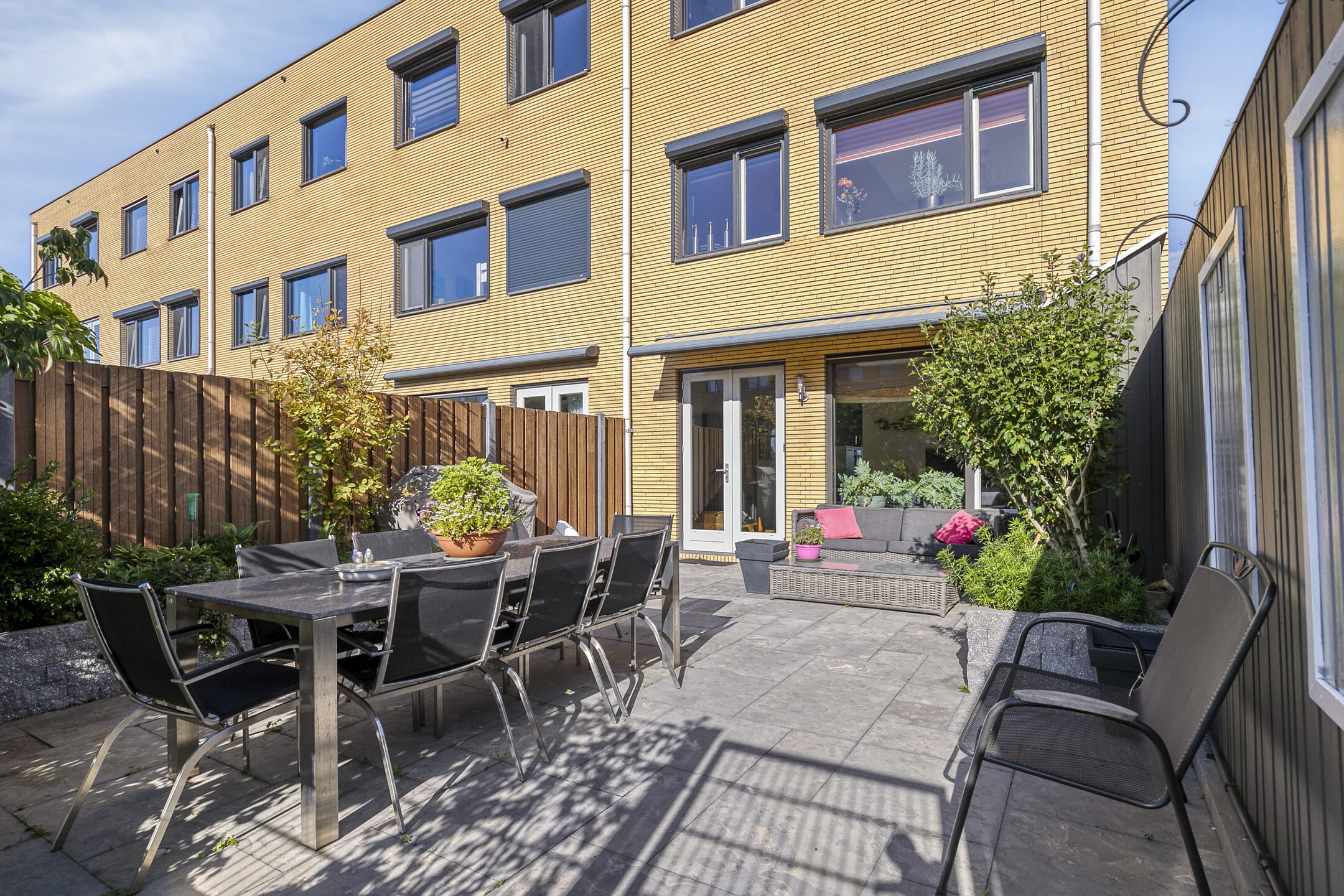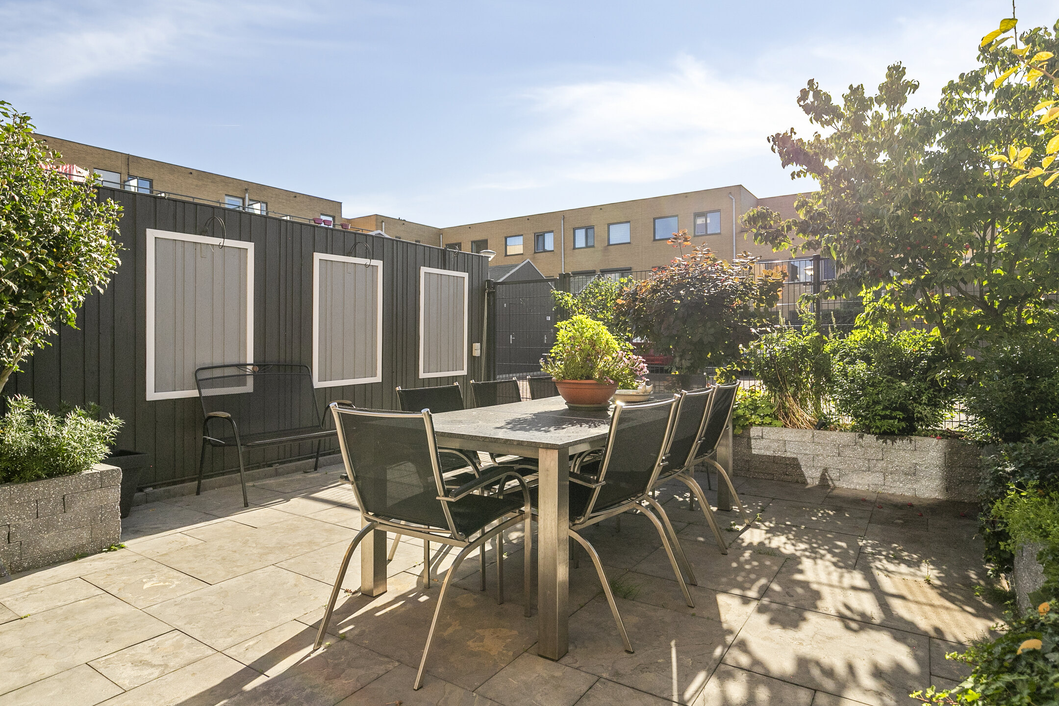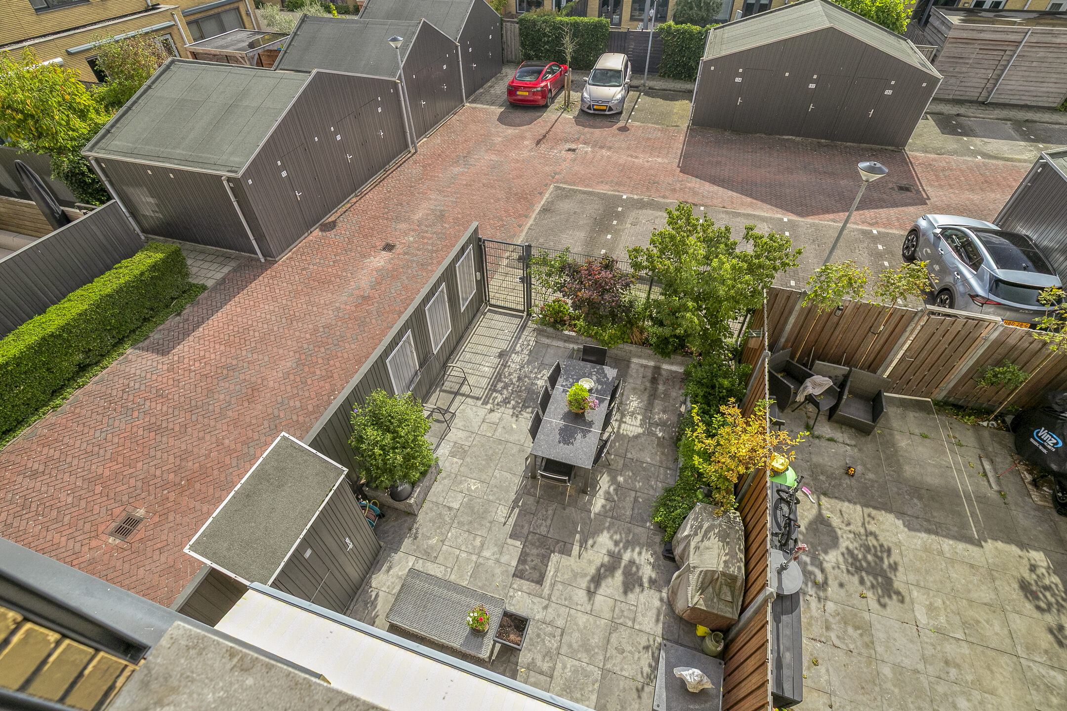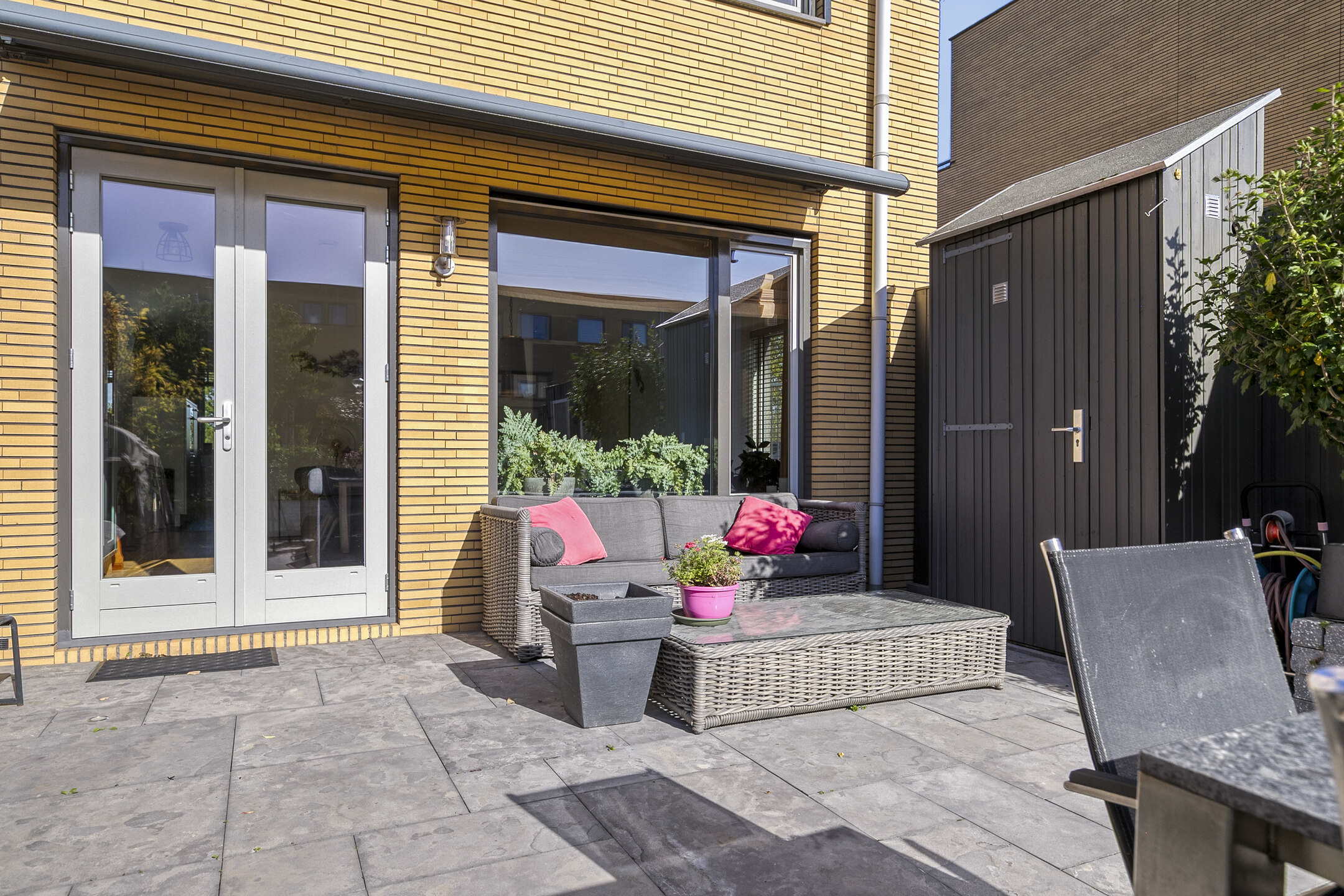 Via de woonkamer stap je de ruime, zonnige achtertuin op het zuiden in. De tuin beschikt over een elektrisch zonnescherm en een tuinkast, ideaal voor het opbergen van tuingereedschap. Op het achtergelegen afgesloten binnenterrein vind je de vrijstaande berging en je eigen parkeerplaats.
