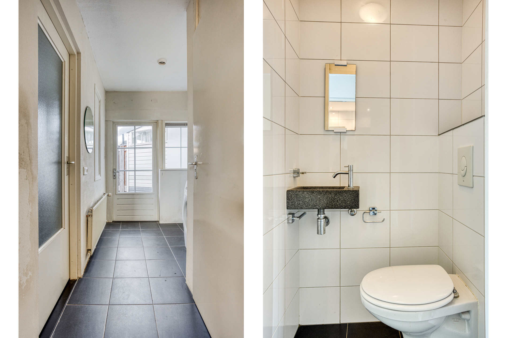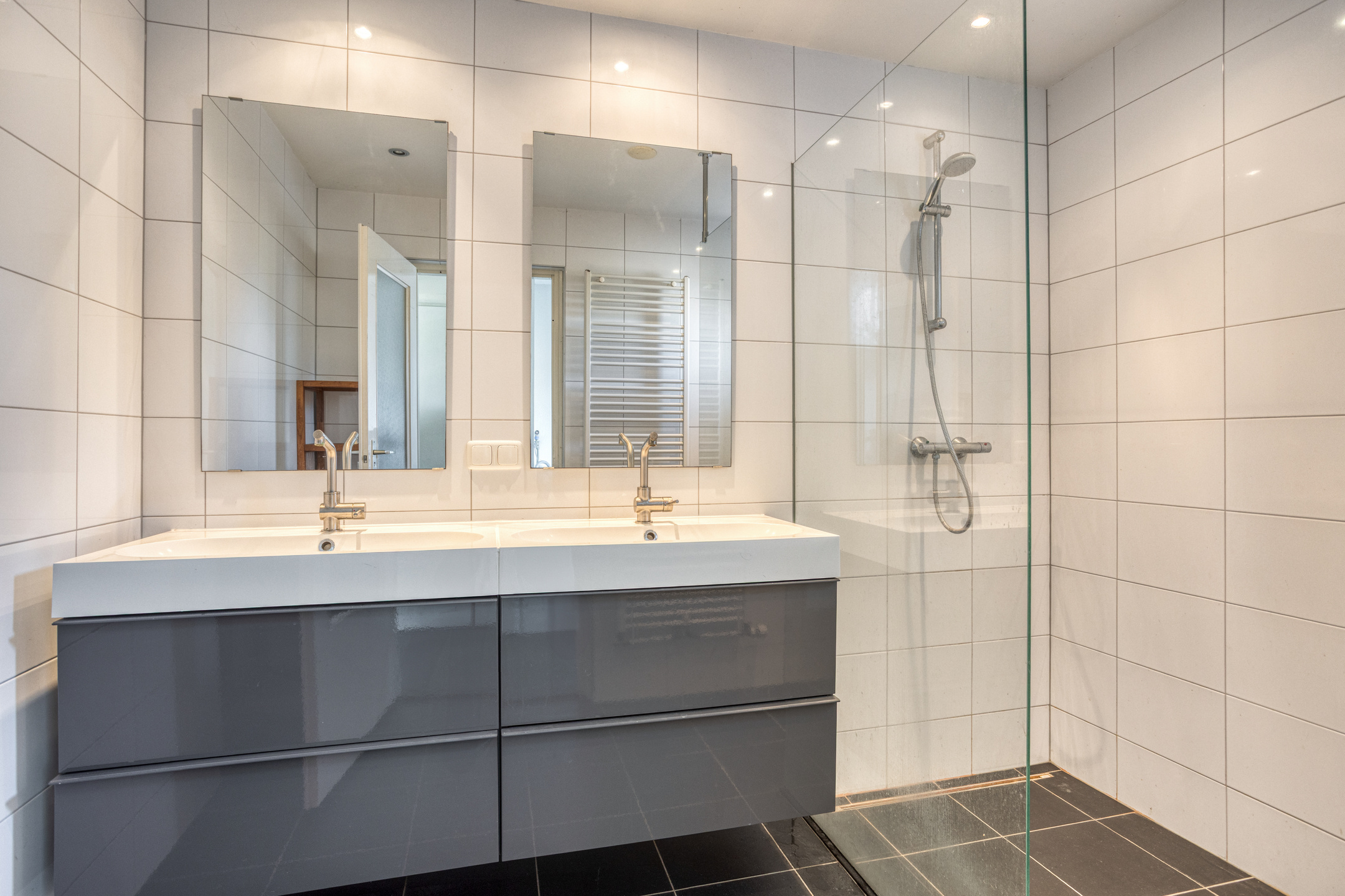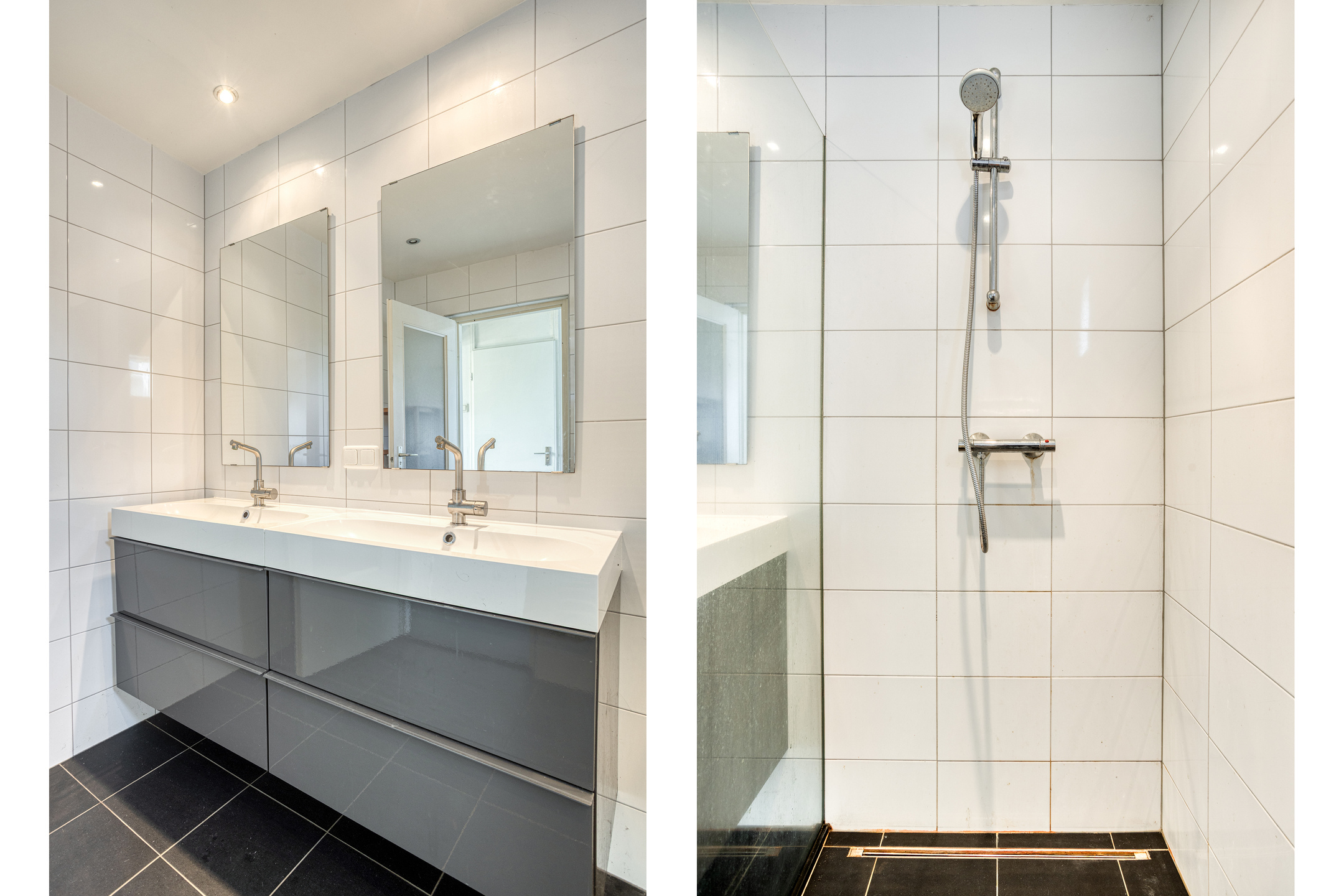 Vanuit de woonkamer is de praktische bijkeuken bereikbaar, met aansluitingen voor wasmachine en droger. Aansluitend vind je de badkamer, voorzien van een dubbele wastafel, inloopdouche en designradiator, en een separaat toilet met fonteintje.