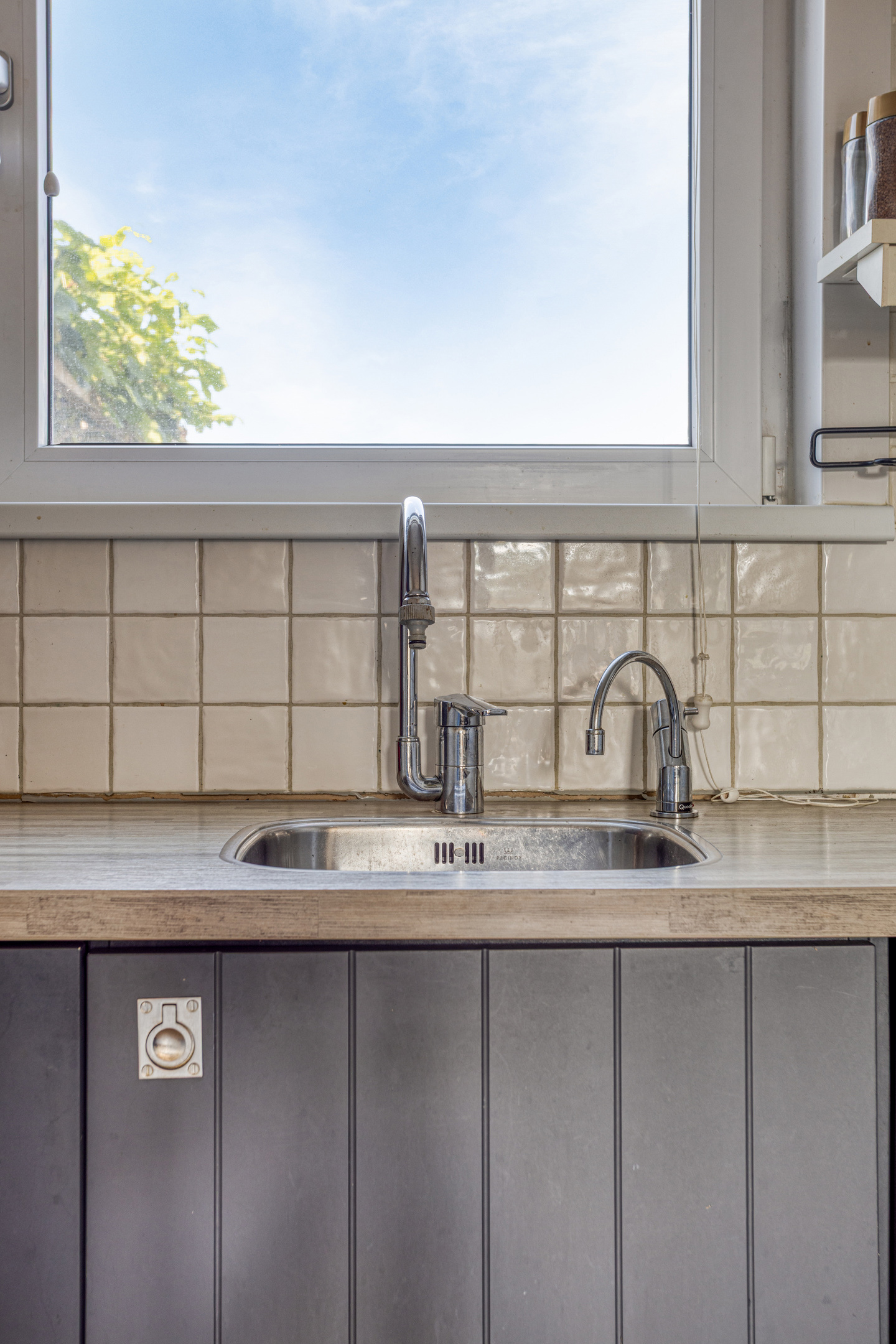 Vanuit de bijkeuken kom je in de ruime achtertuin. De tuin is volledig betegeld en gelegen op het Noorden.