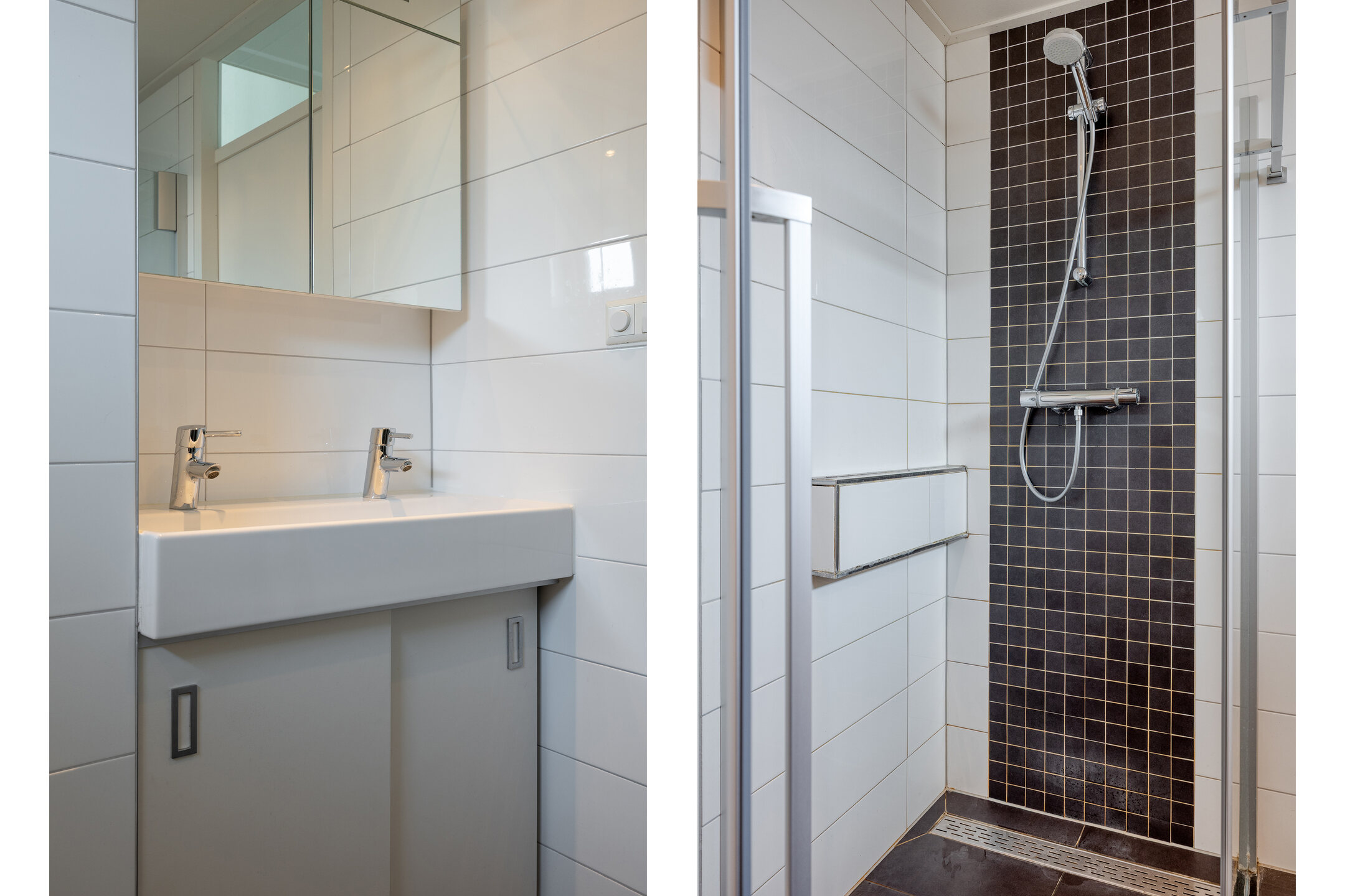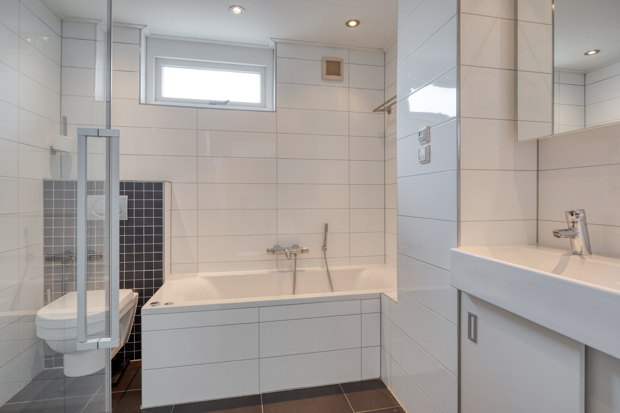 De badkamer is compleet uitgevoerd met een ligbad, dubbele wastafel, toilet, mechanische ventilatie en elektrische vloerverwarming.