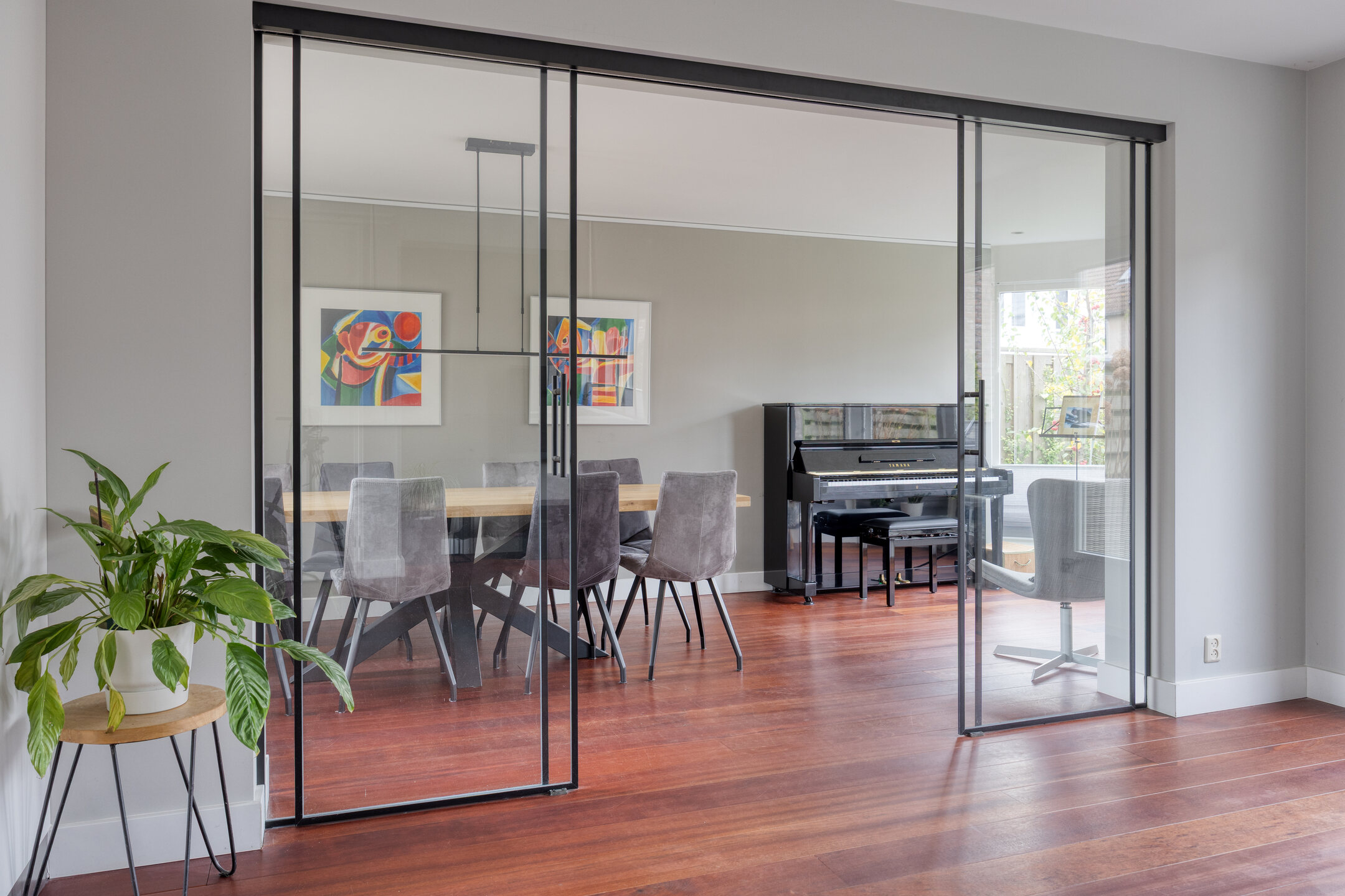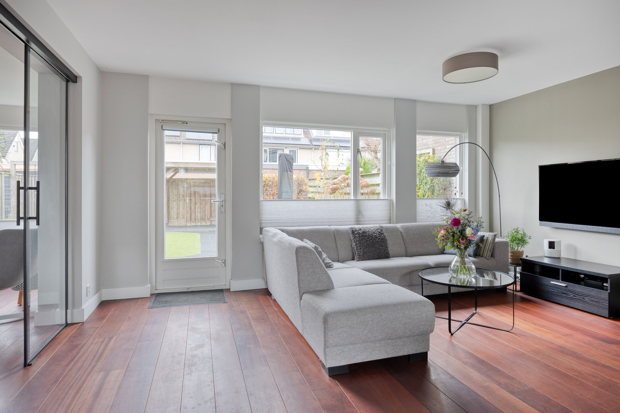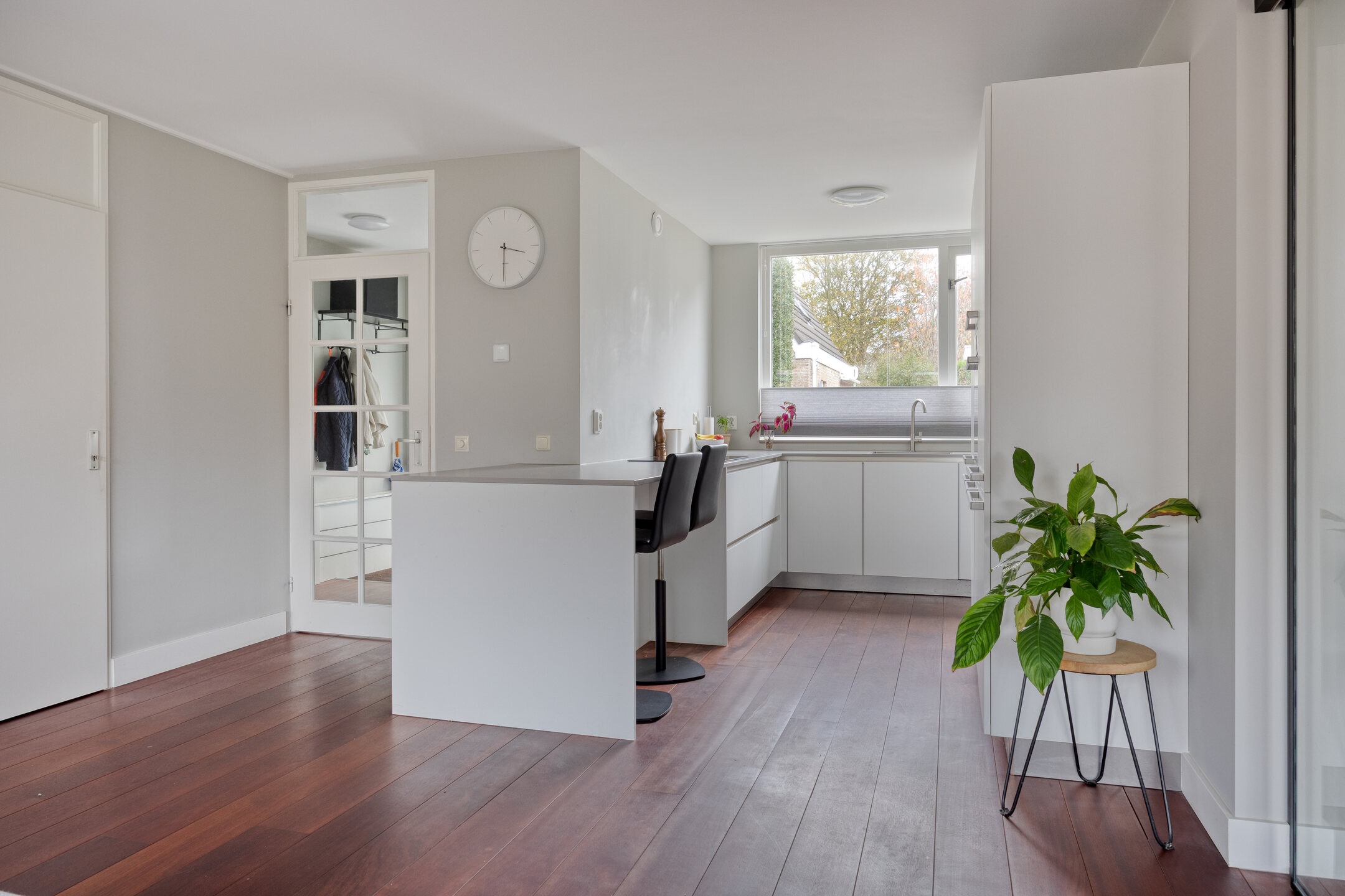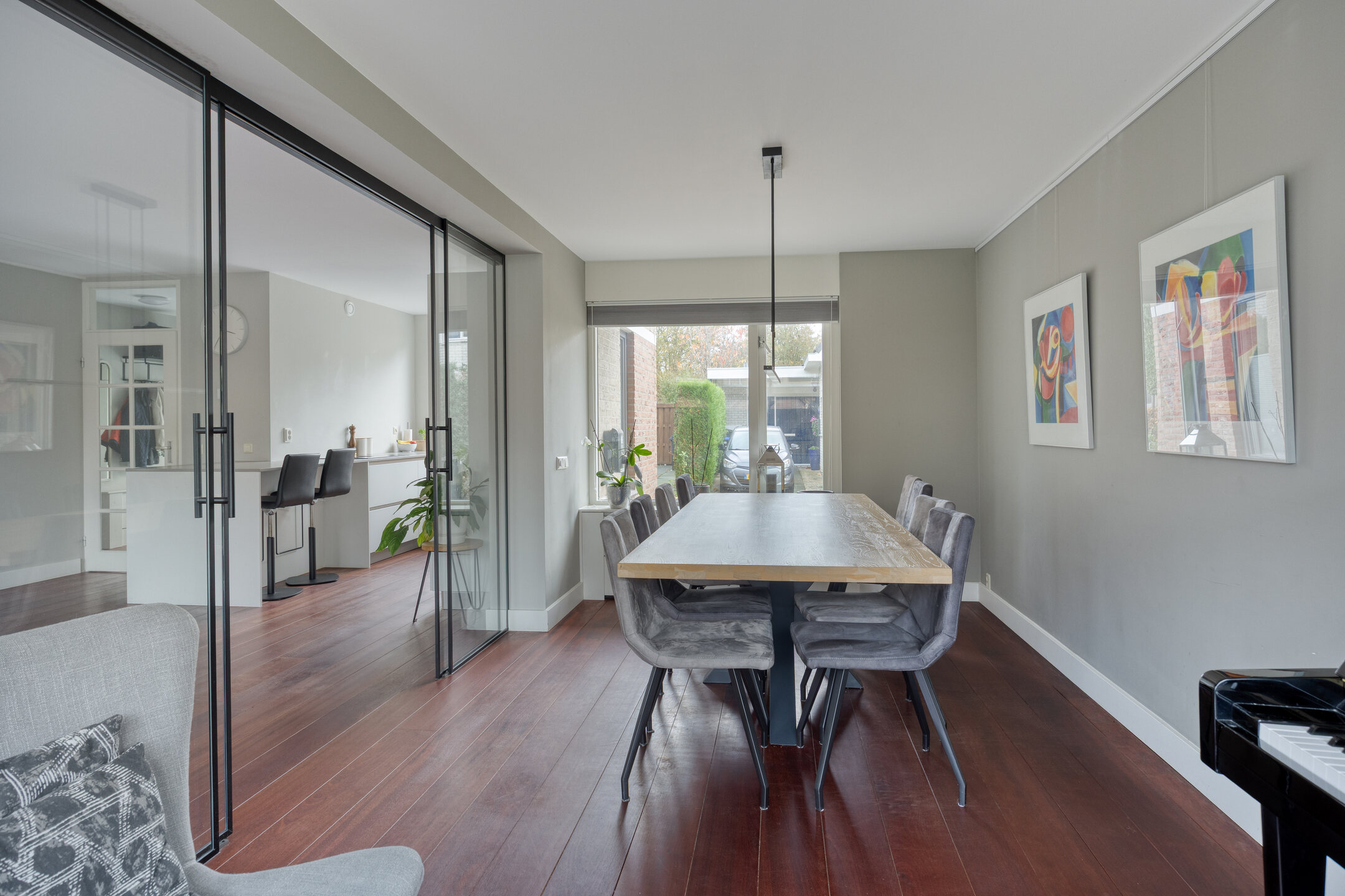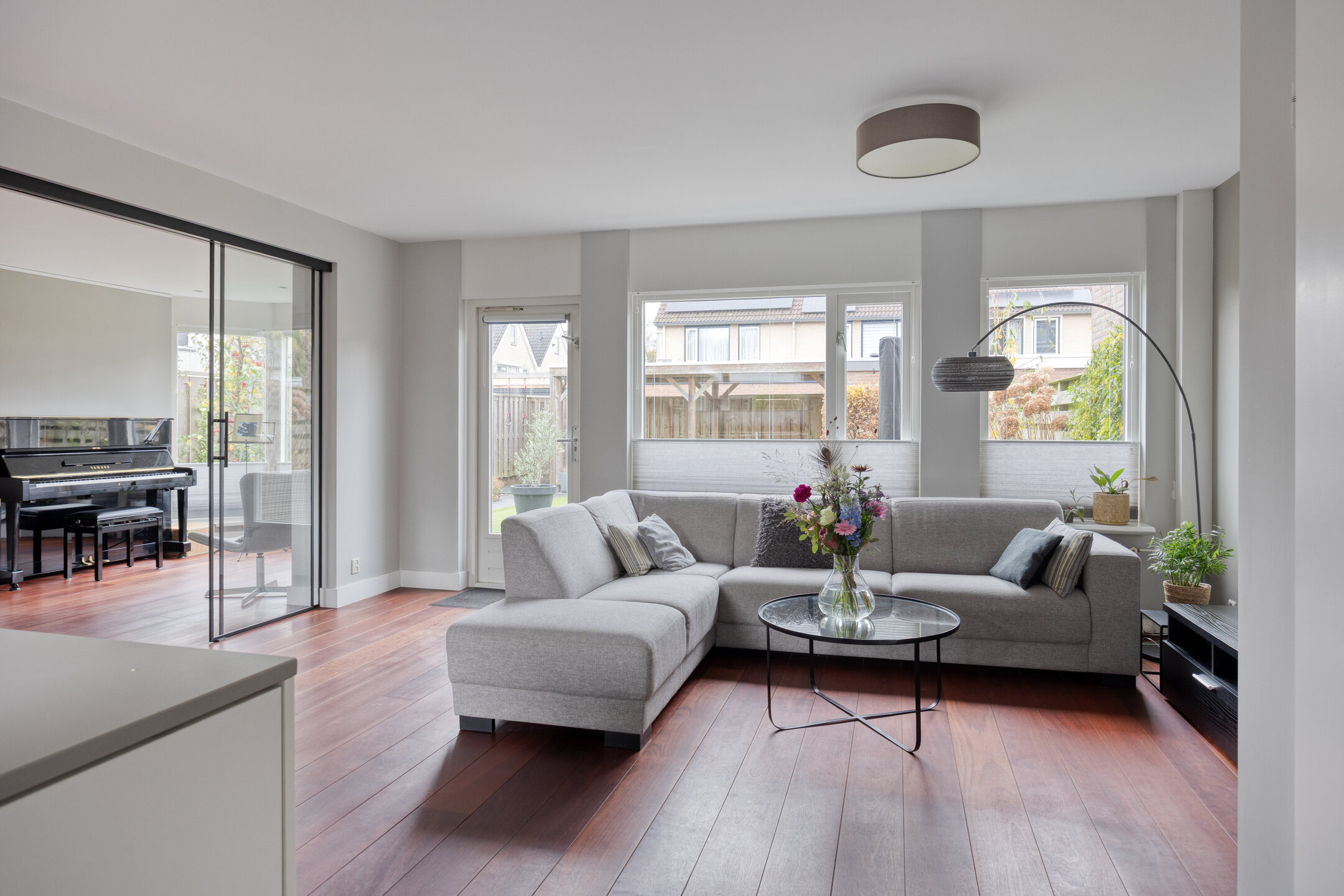 De gehele begane grond is voorzien van een fraaie hardhouten vloer. De royale en lichte woonkamer is dankzij de zij-uitbouw extra ruim. In deze uitbouw zorgt de erker voor een sfeervolle en lichte hoek, ideaal als zitplek, eetkamer of werkruimte. De uitbouw is bovendien af te sluiten met moderne schuifdeuren, waardoor je de ruimte flexibel kunt gebruiken: als aparte kamer of juist als onderdeel van een grote leefruimte.