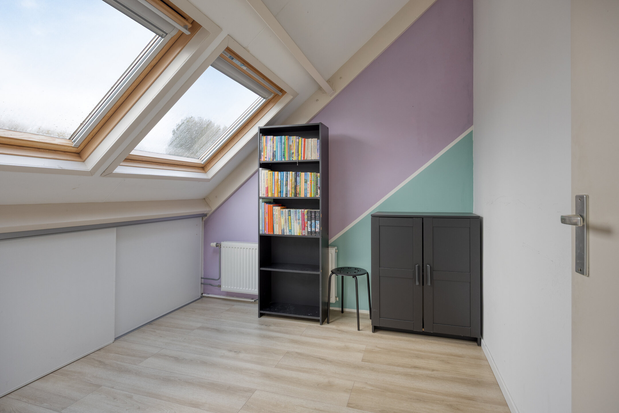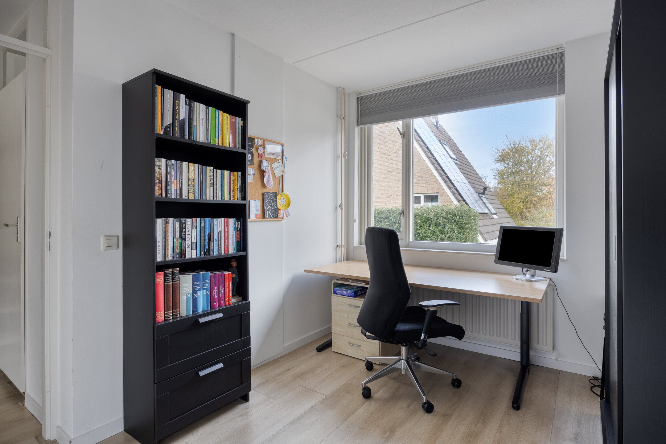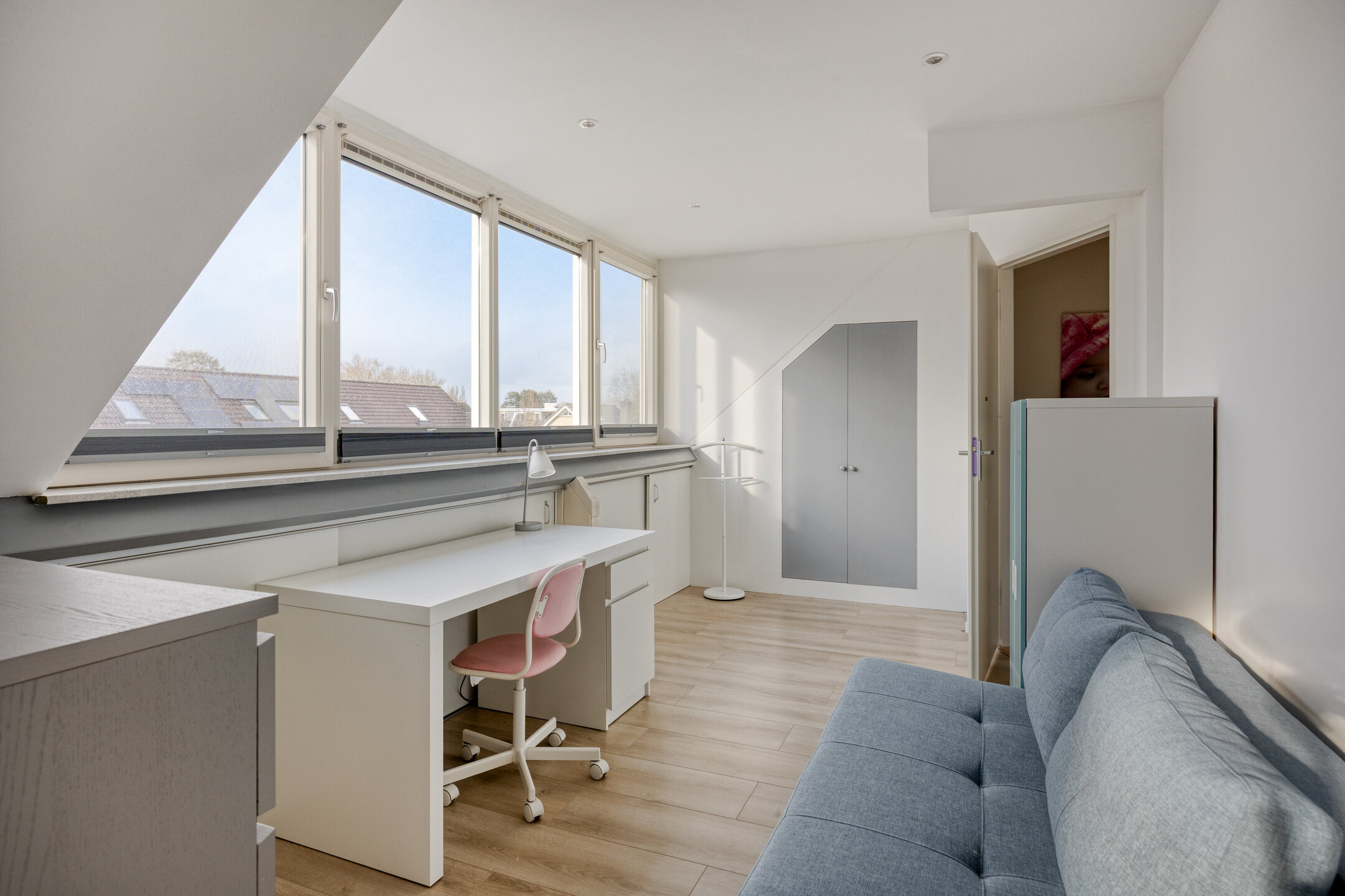 Voorkamer ca. 3.07 x 5.09 m: een lichte chill-/werkruimte met kunststof dakkapel, praktische knieschotten.