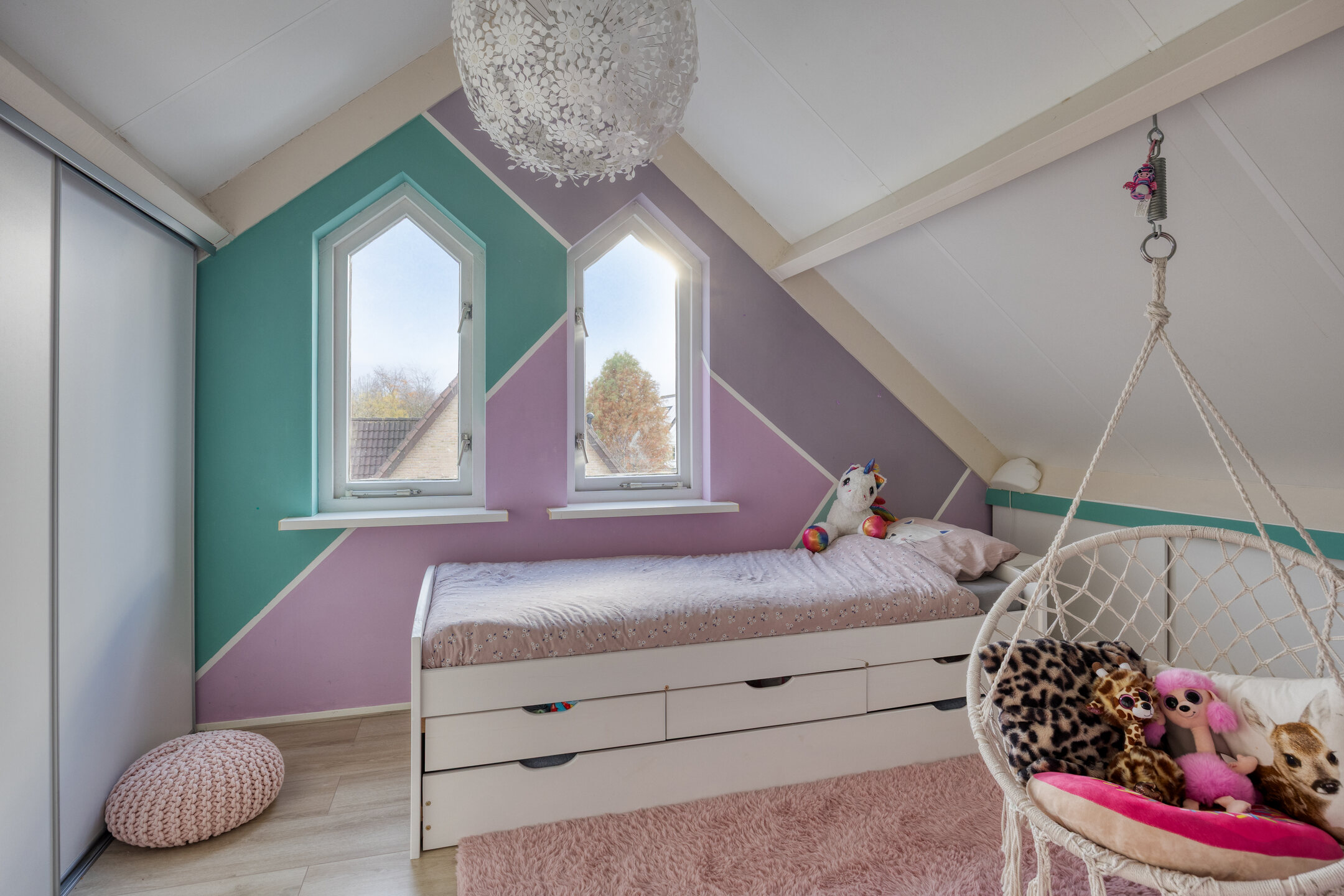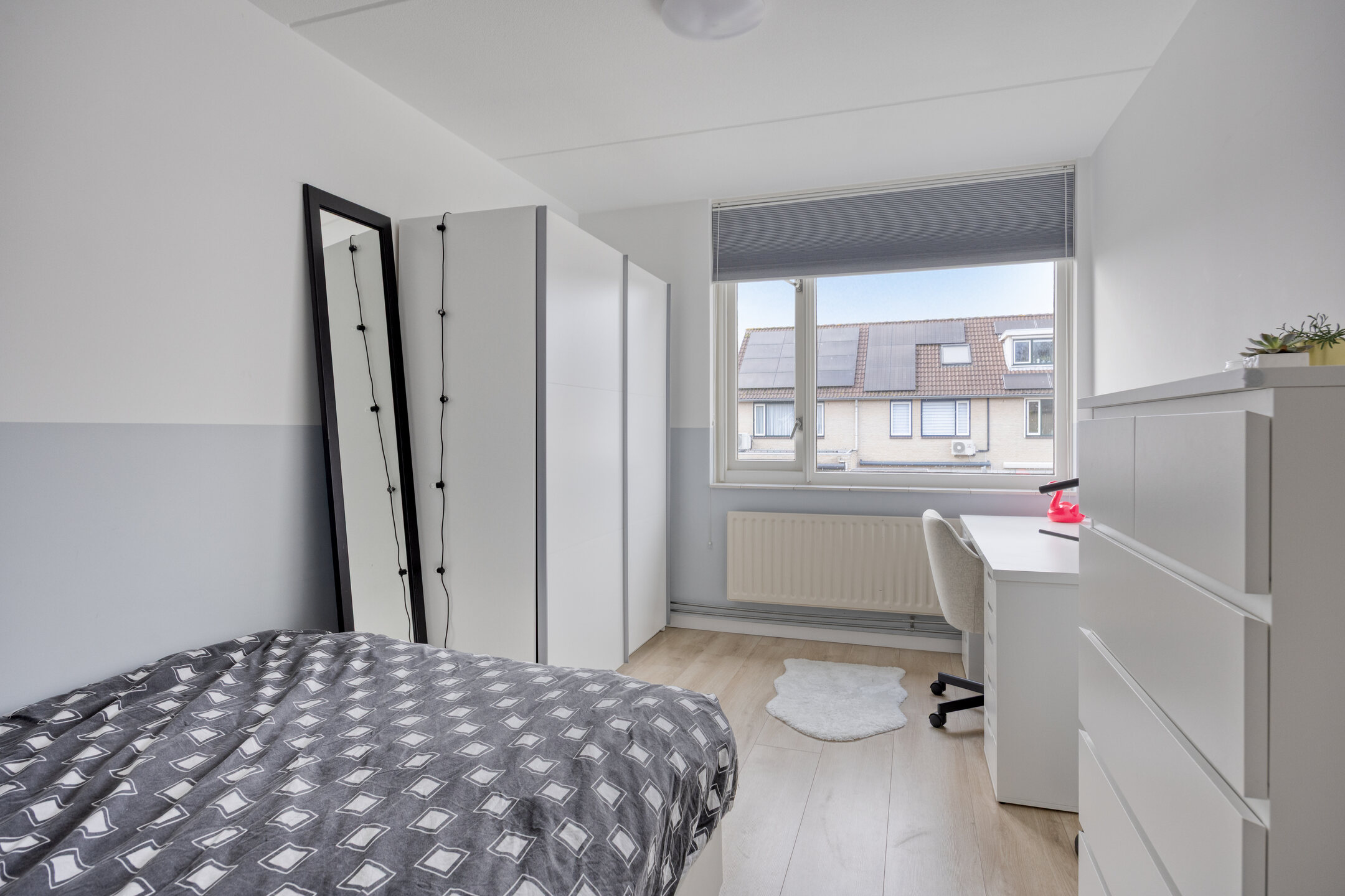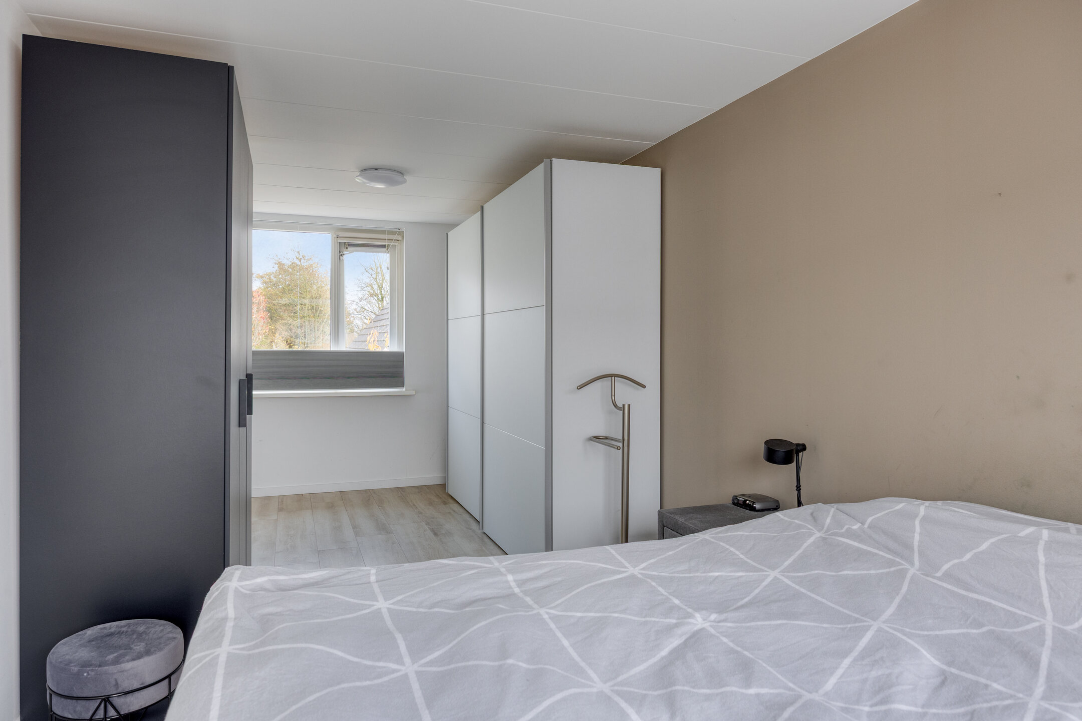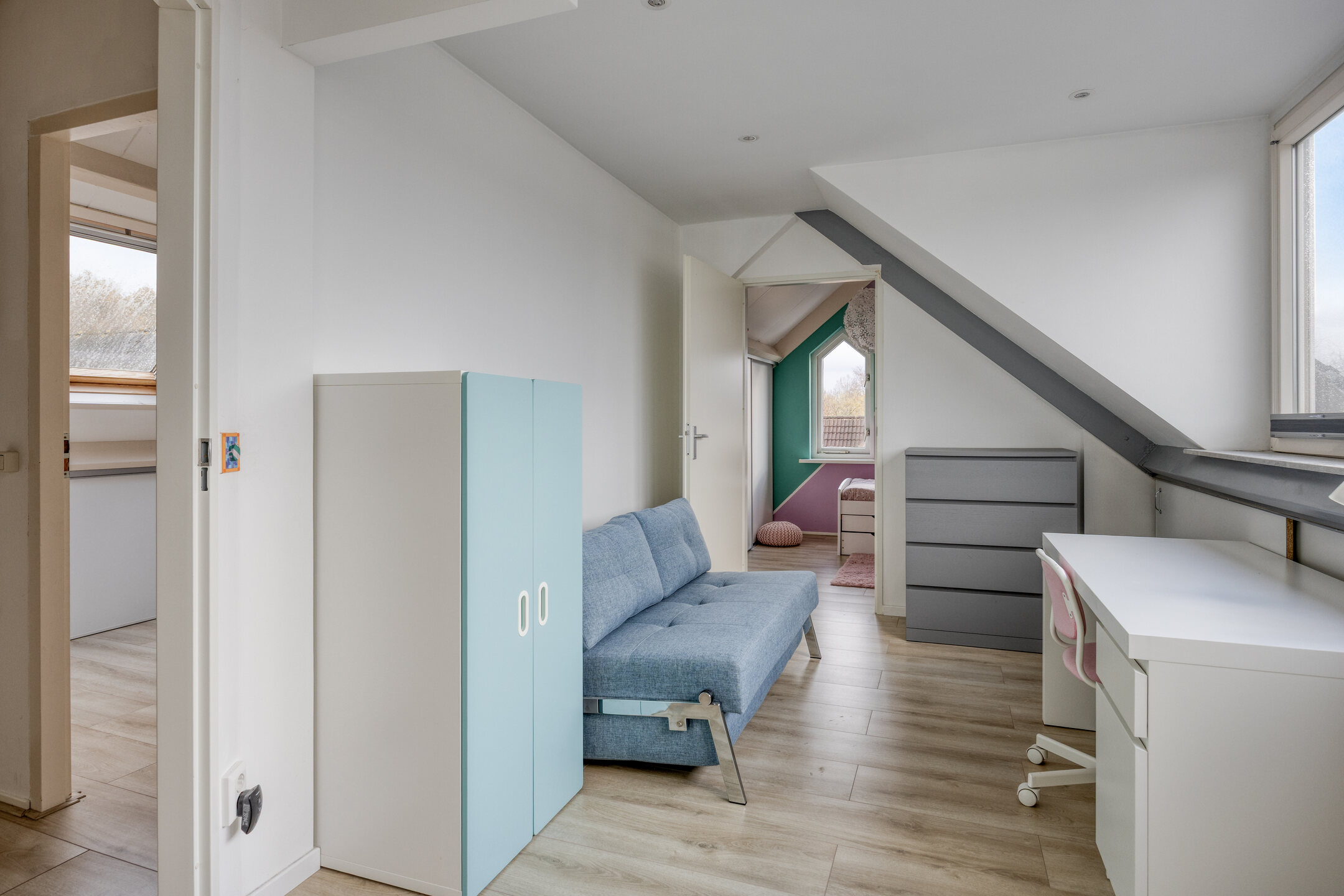 Slaapkamer 5, gelegen aan de achterzijde, bestaat uit twee met elkaar verbonden ruimtes: