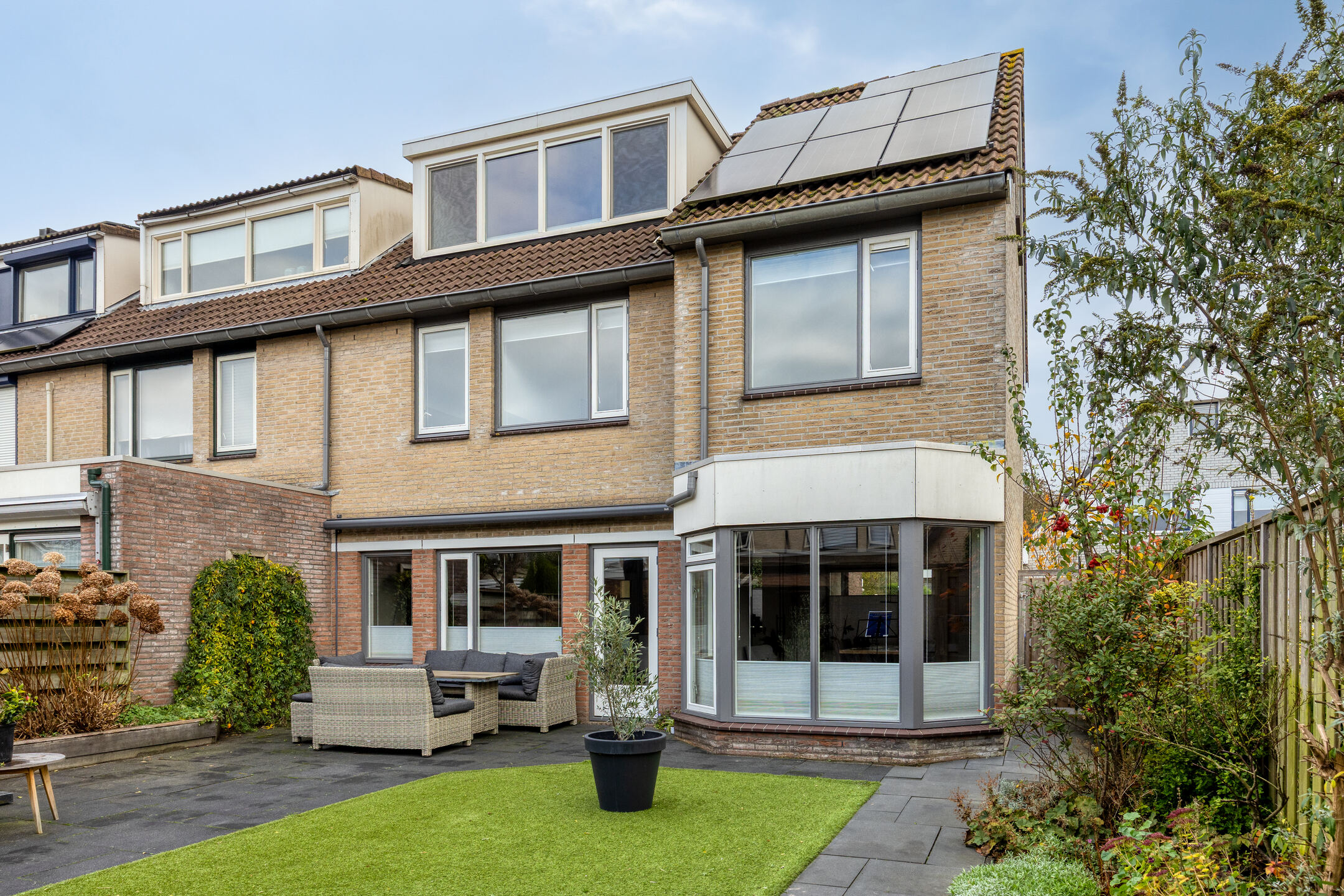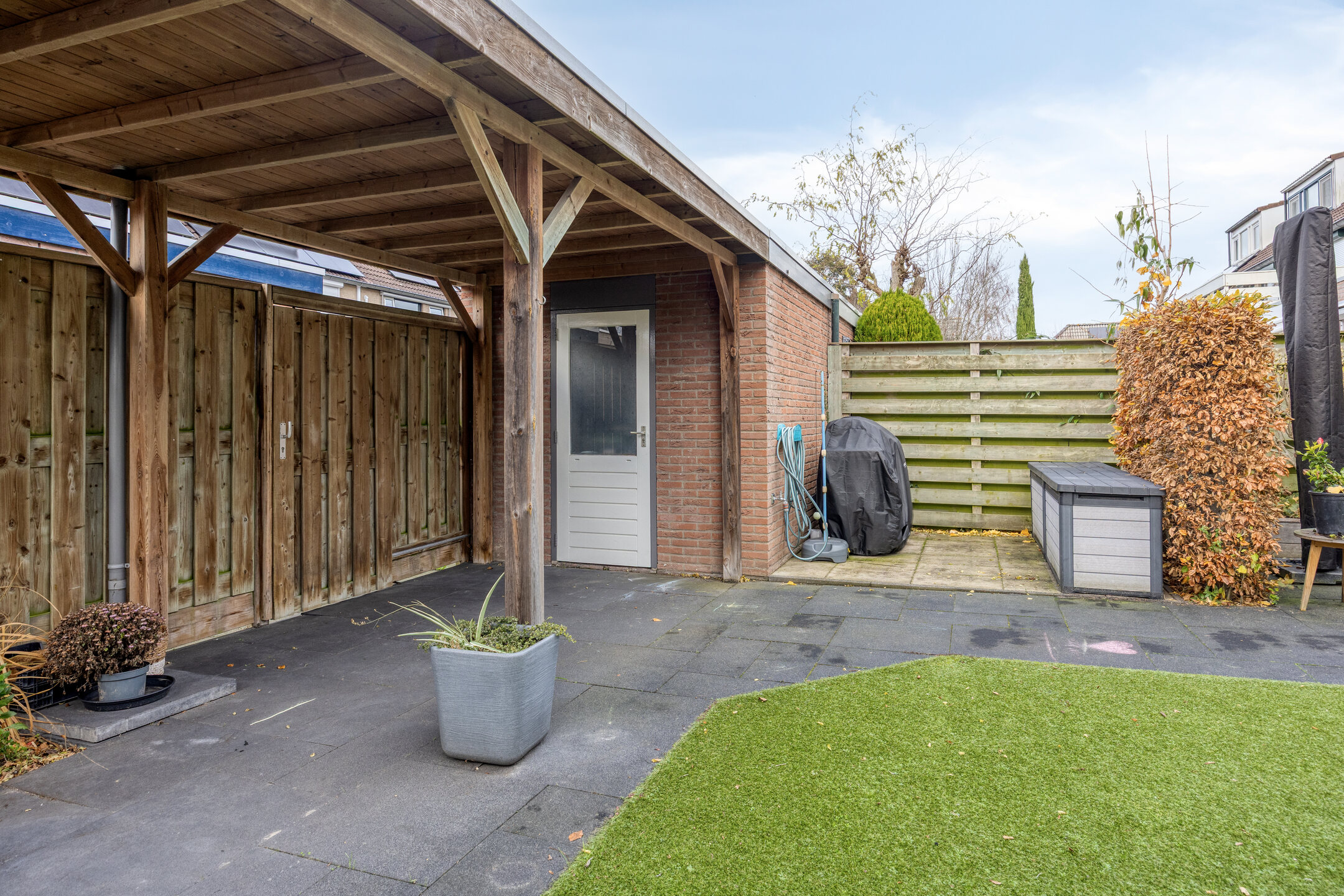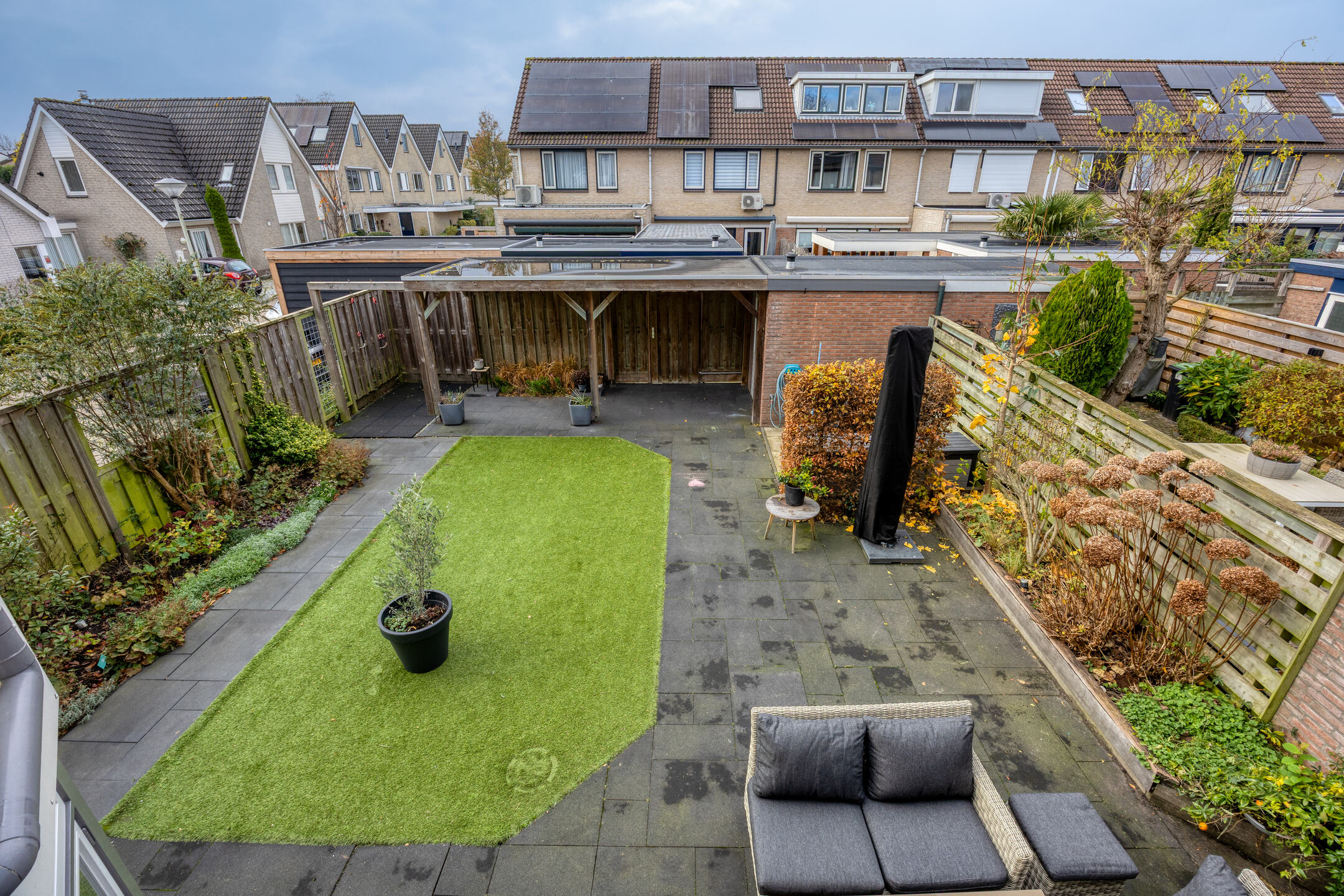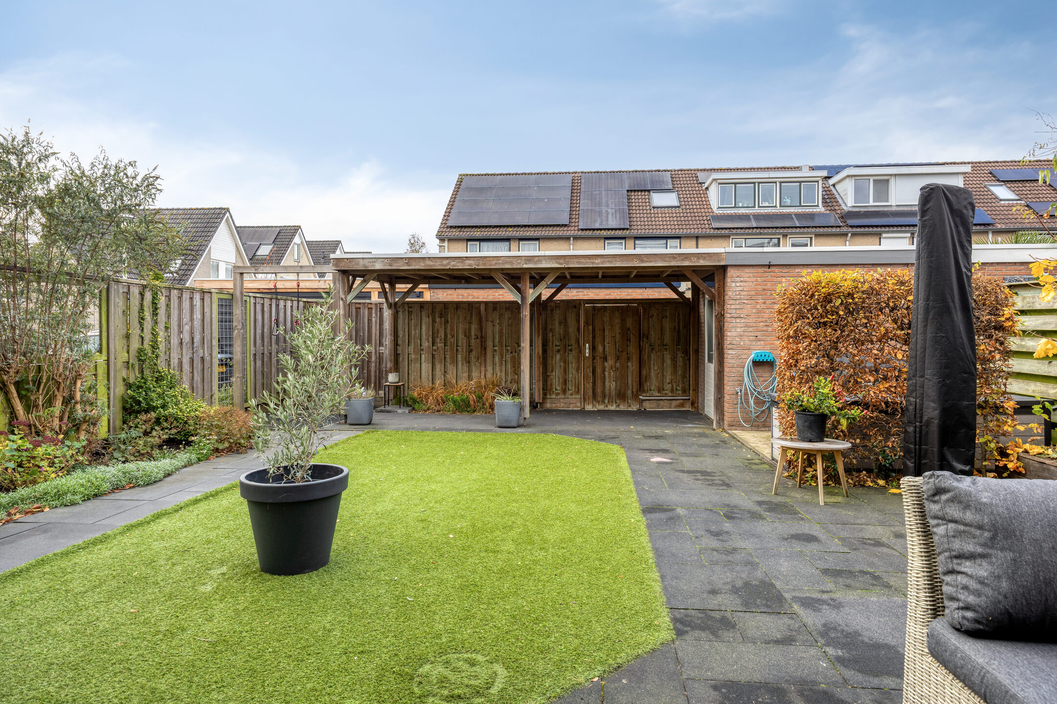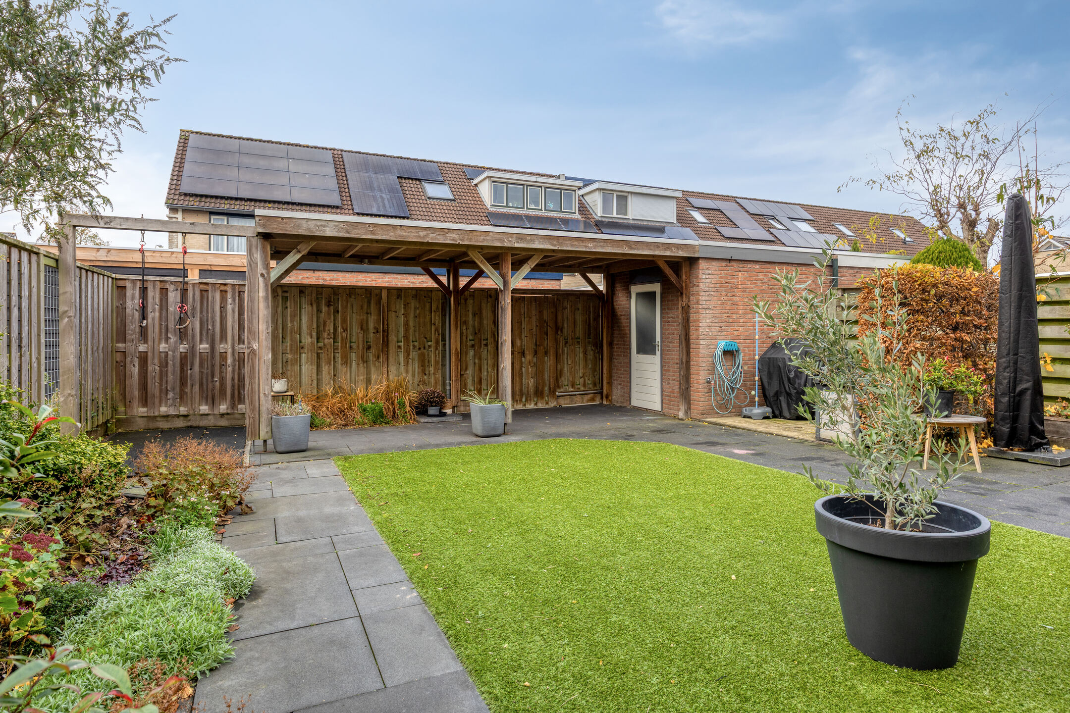 De tuin is prachtig aangelegd met diverse beplanting, waaronder een royale vlinderstruik, een bloeiende passiebloem, een Annabelle hortensiastruik direct achter het huis en een fraaie Ginkgo-boom. Dankzij de overkapping heb je altijd een beschutte plek om buiten te zitten, ook bij minder weer. Verder is er een achterom, een stenen berging en een elektrisch zonnescherm aanwezig.