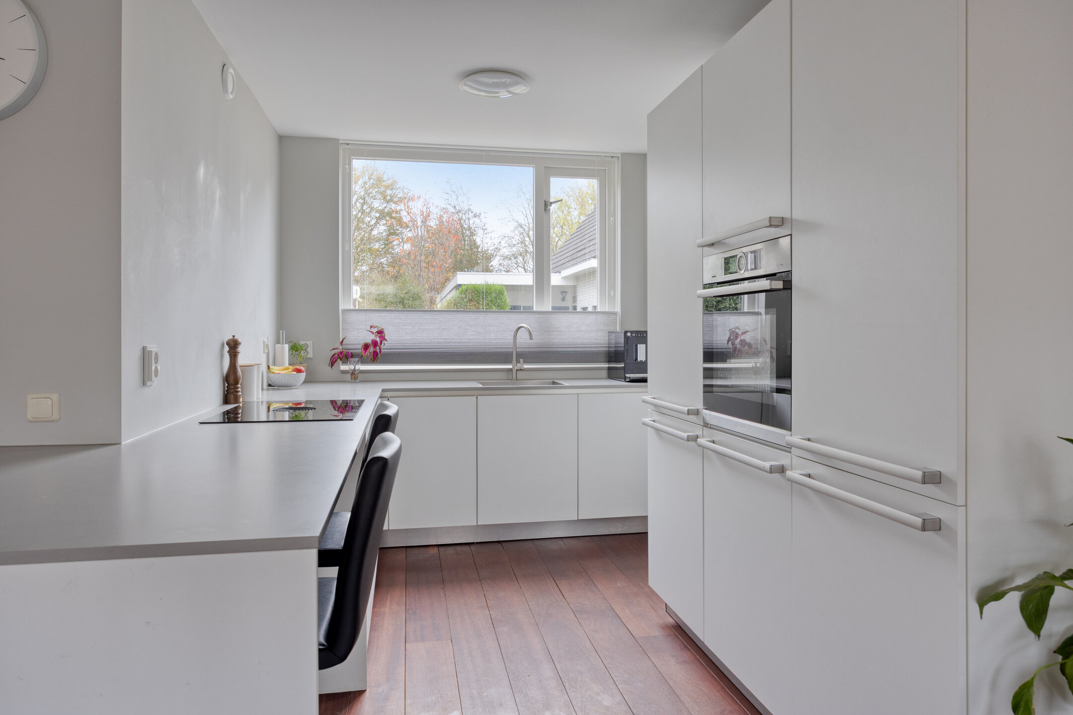 De keuken, gelegen aan de voorzijde, is modern en compleet uitgerust met een inductiekookplaat met Bora-afzuigsysteem, koel-vriescombinatie, vaatwasser, combimagnetron en een spoelbak met mengkraan.