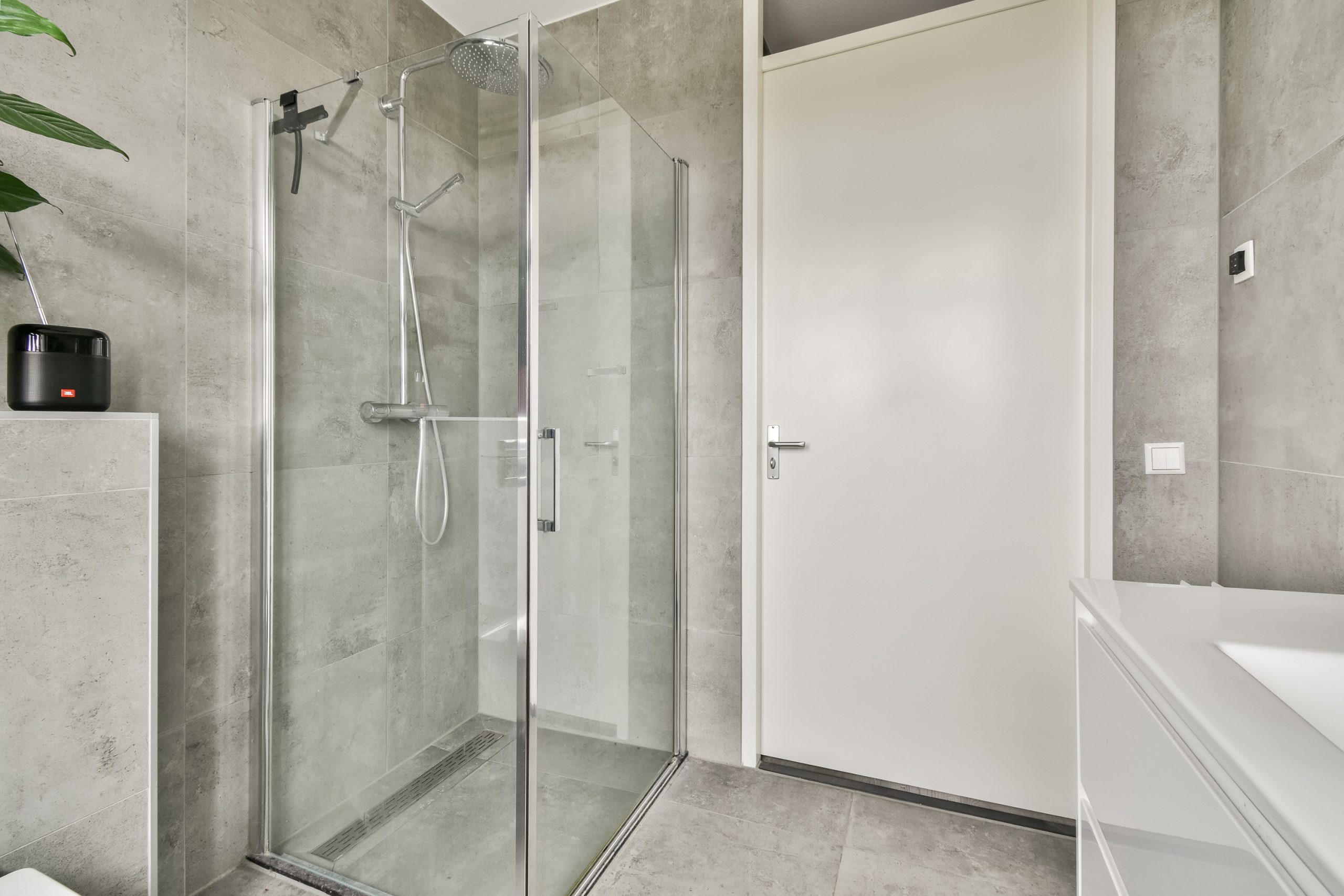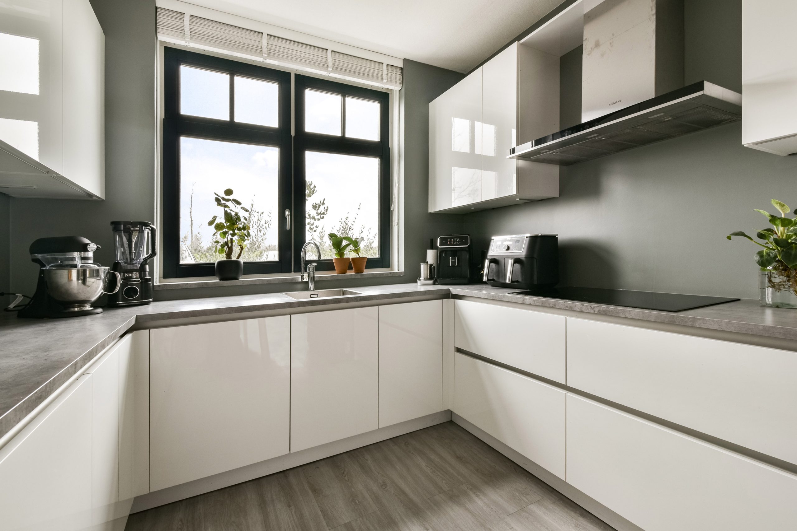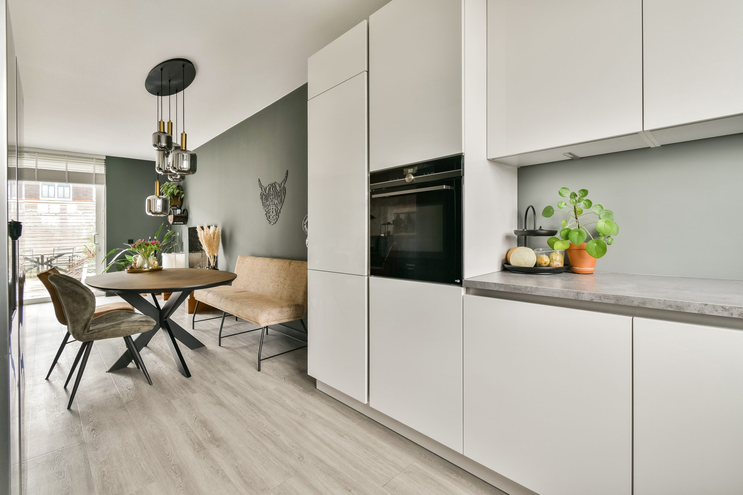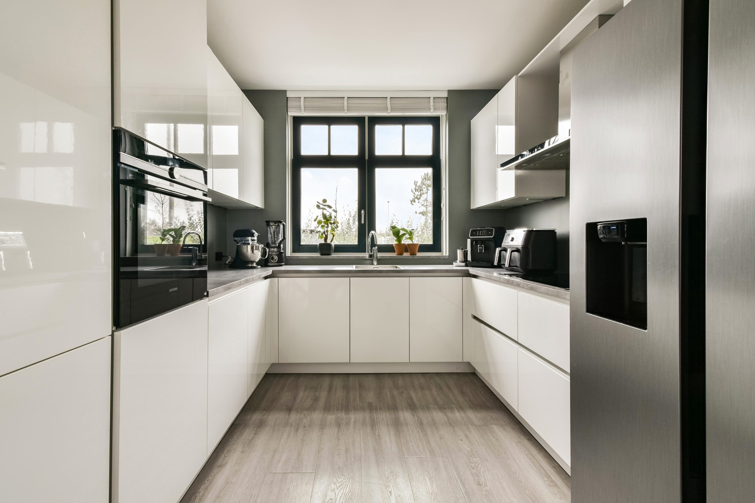 De lichte en ruim opgezette woonkamer is voorzien van een pvc-vloer en heeft middels een schuifpui toegang tot de achtertuin. De keuken is uitgevoerd in een stijlvolle U-opstelling en voorzien van diverse inbouwapparatuur, waaronder een inductie kookplaat, combi- oven, afzuigkap en vaatwasser.