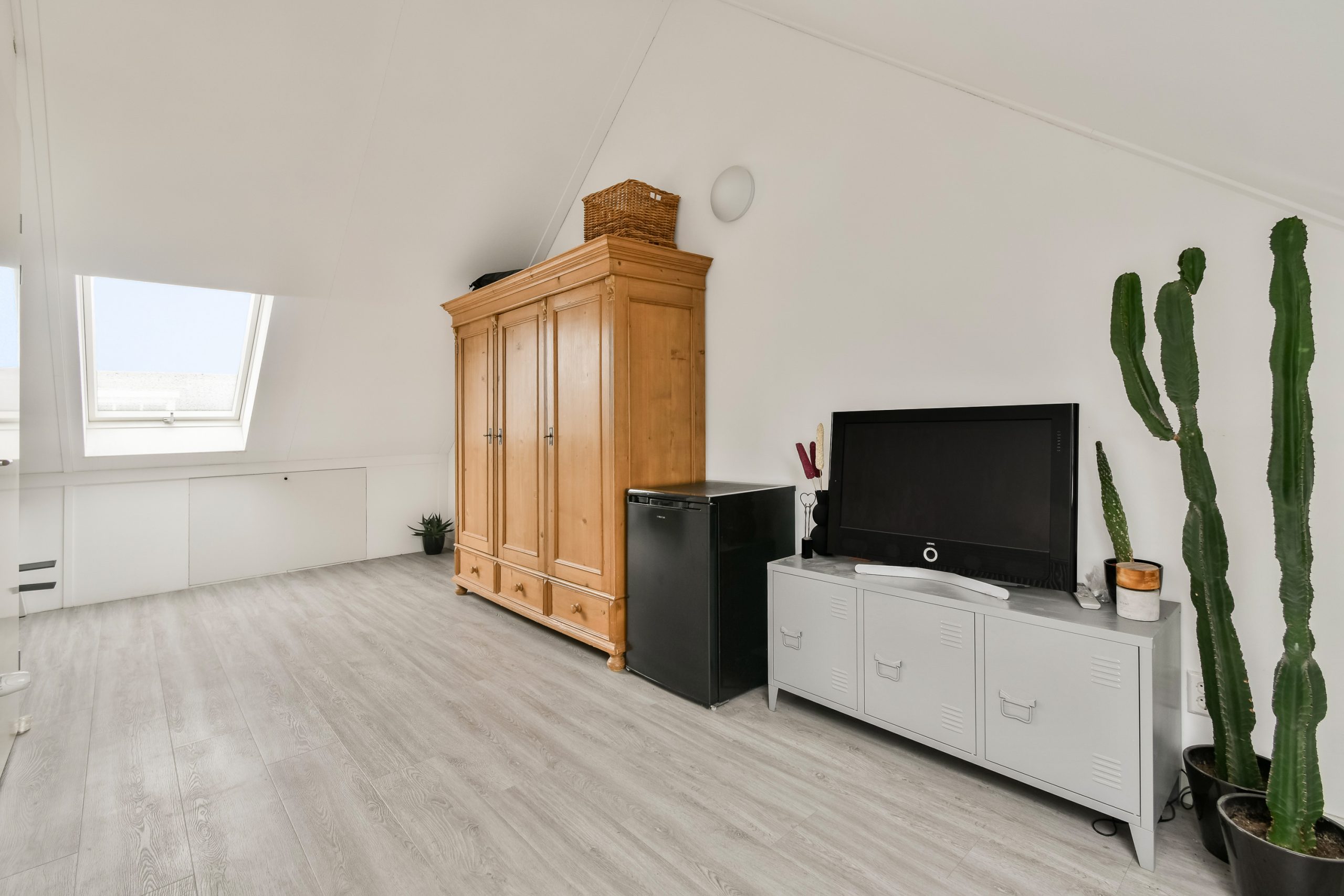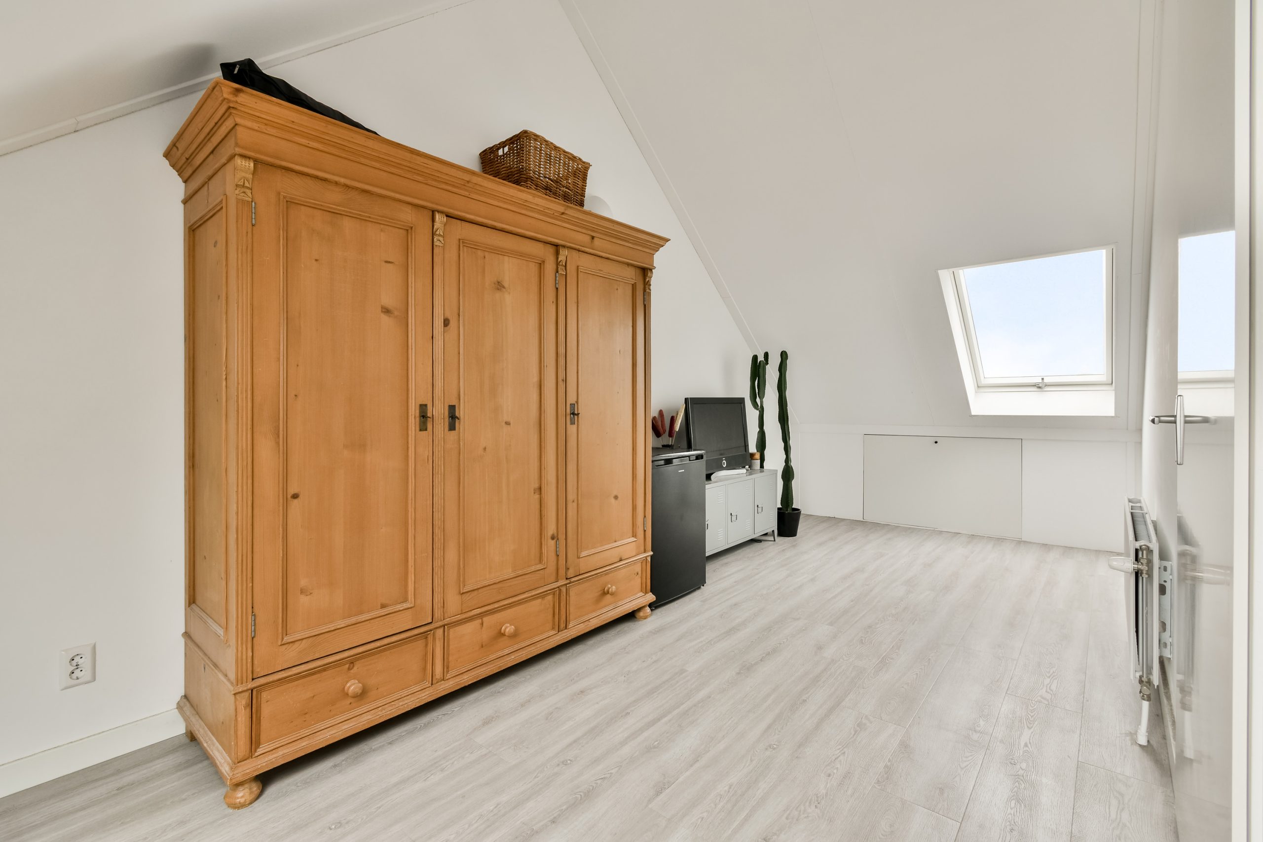 Overloop met toegang tot de opstelplaats voor de wasmachine, droger en cv-combiketel. De ruime zolderkamer beschikt over een Velux dakraam, biedt voldoende opslagruimte en is tevens geschikt als extra slaapkamer.