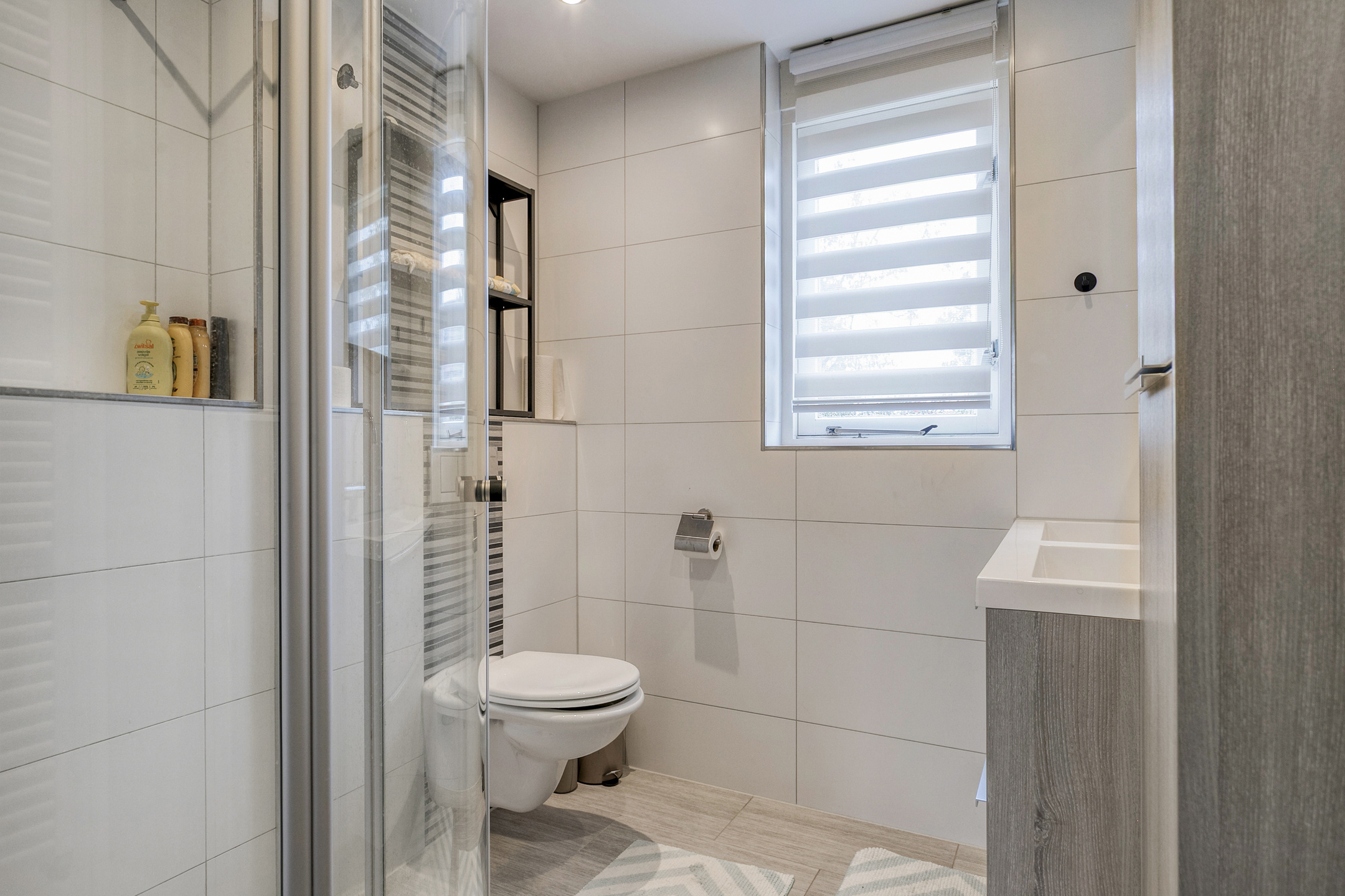 De badkamer is uitgevoerd met een douche, toilet, handdoekradiator en dubbele wastafel met meubel en elektrische vloerverwarming.