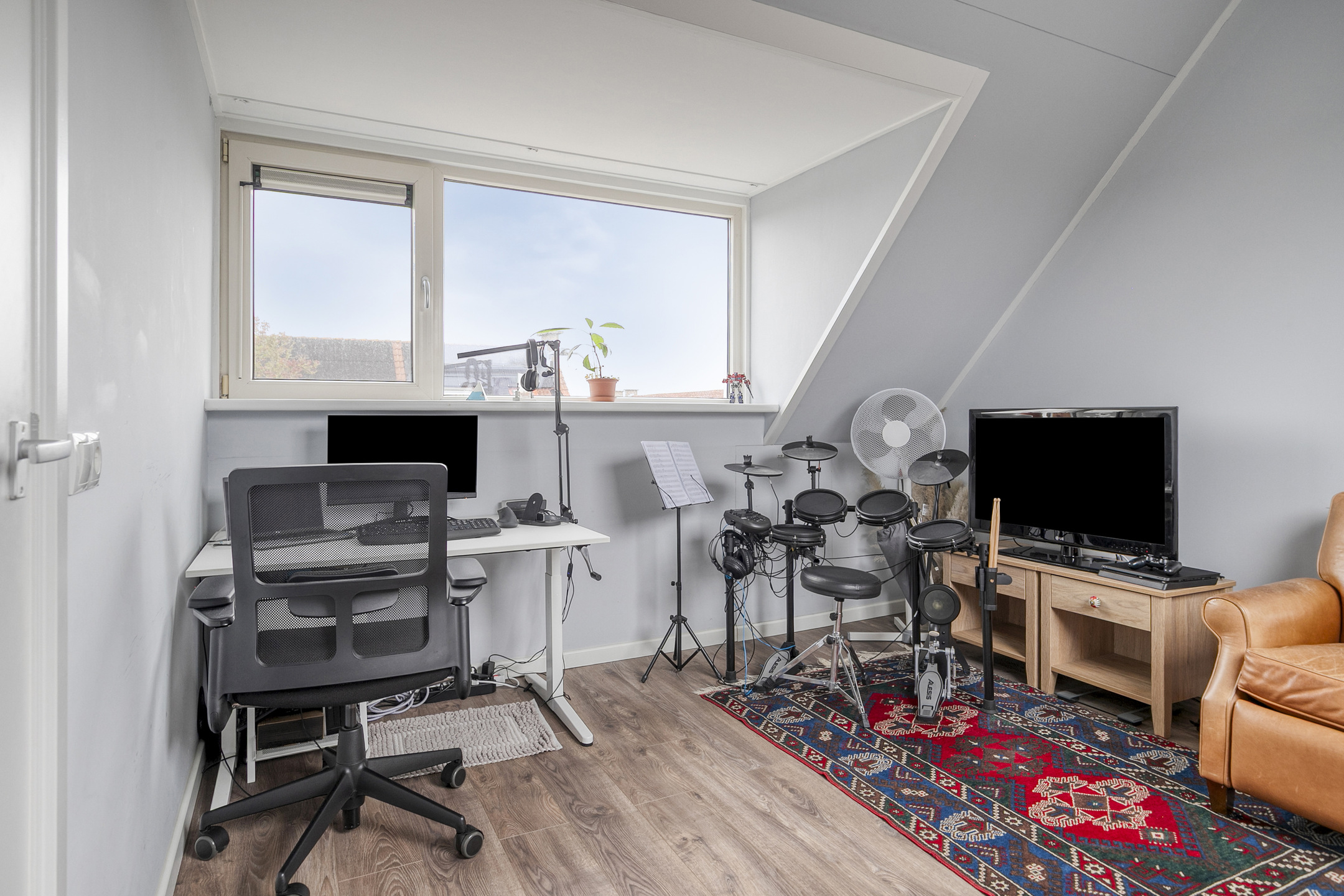 Ruime zolder slaapkamer (nu in gebruik als werkkamer) met aan de voorzijde een dakkapel met kunststof kozijnen en aan de achterzijde een groot dakraam.