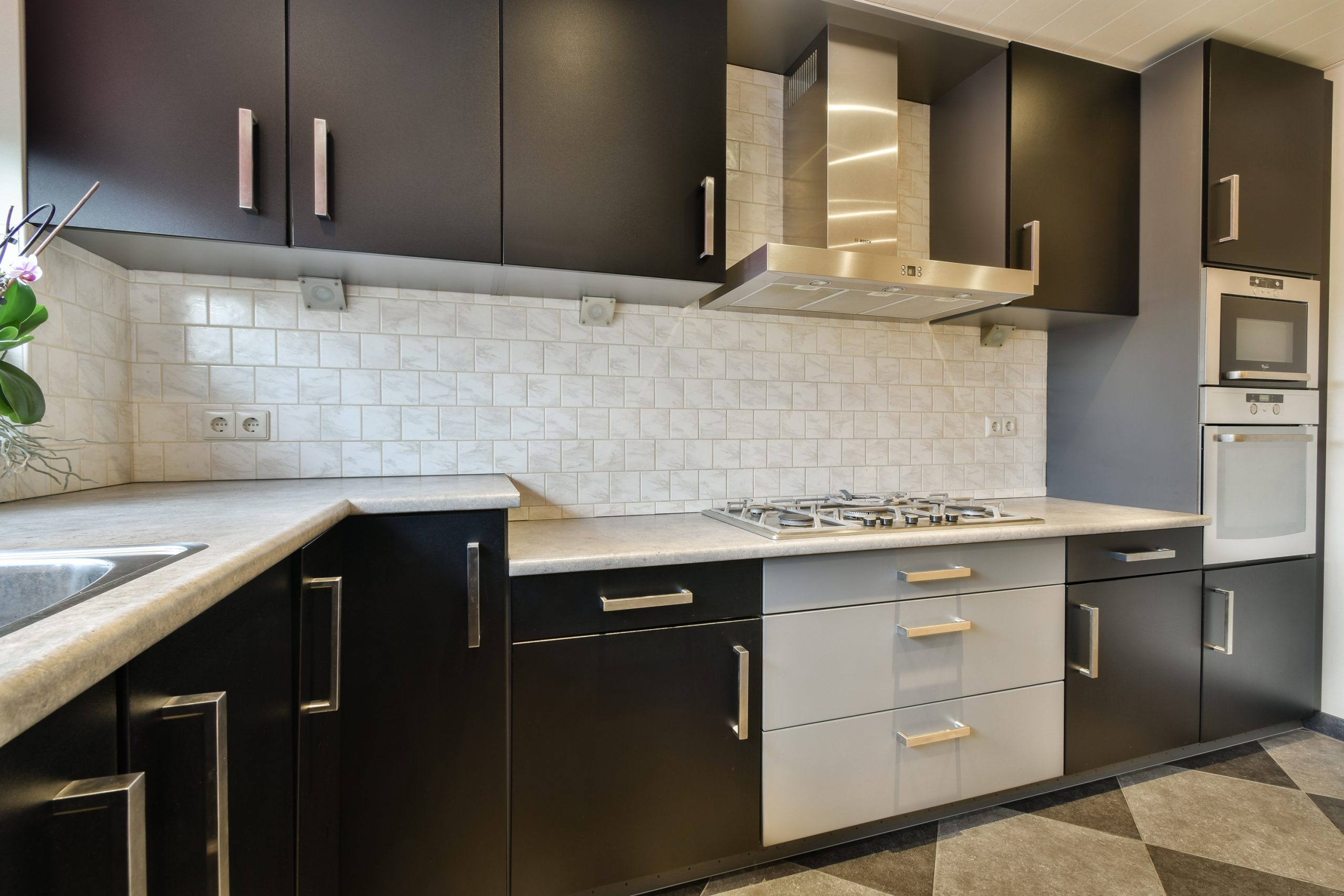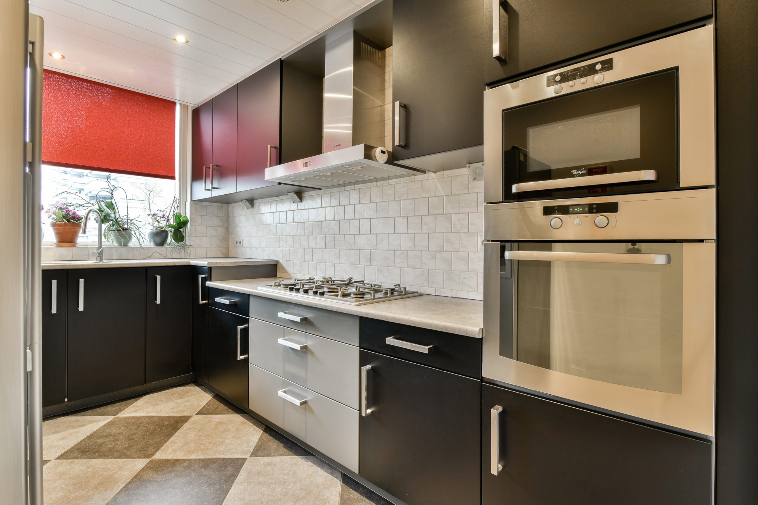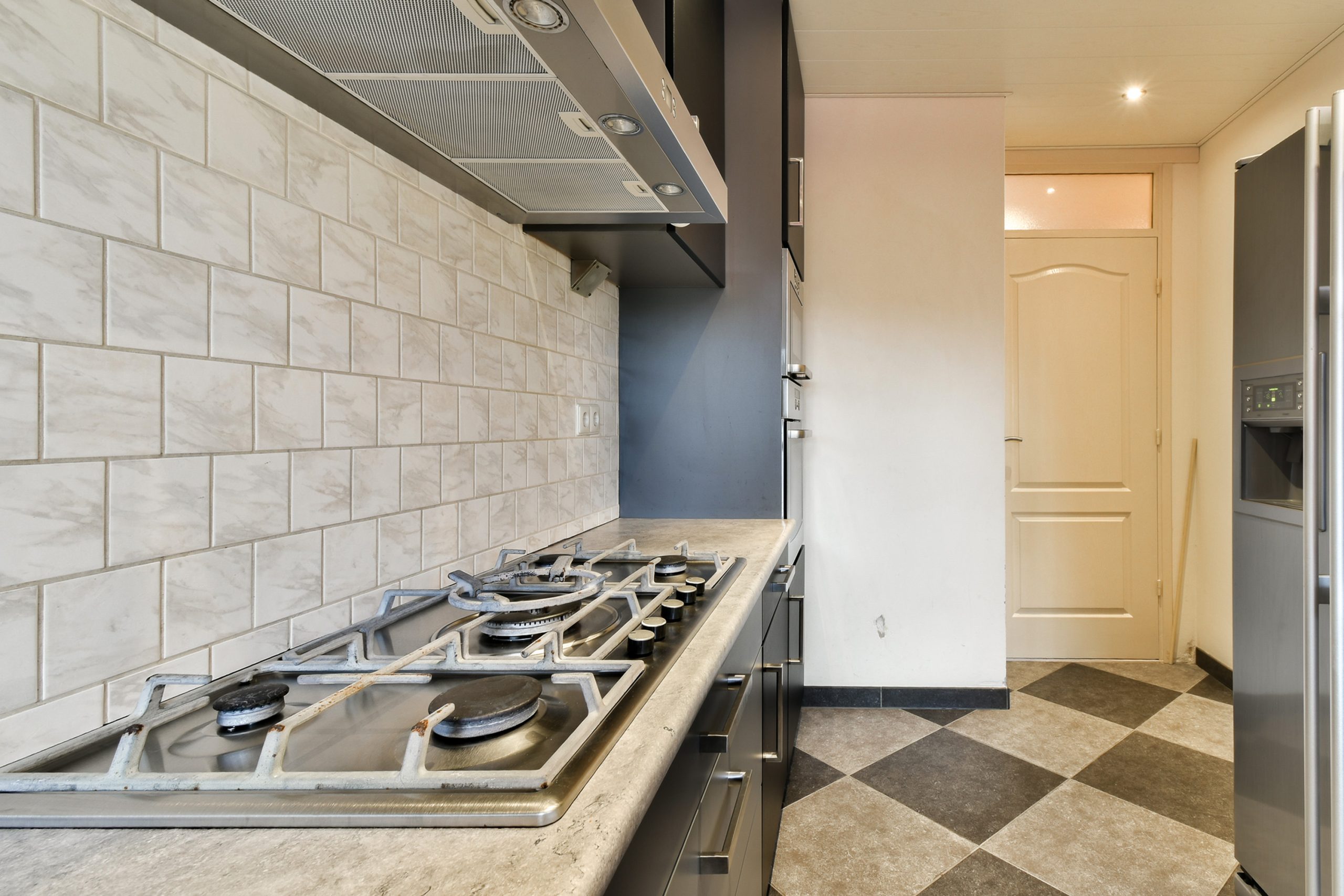 De keuken is uitgerust met diverse inbouwapparatuur, waaronder een vaatwasser, oven, magnetron, gasfornuis, afzuigkap en een koelkast-vriezercombinatie met ijs- en waterdispenser.