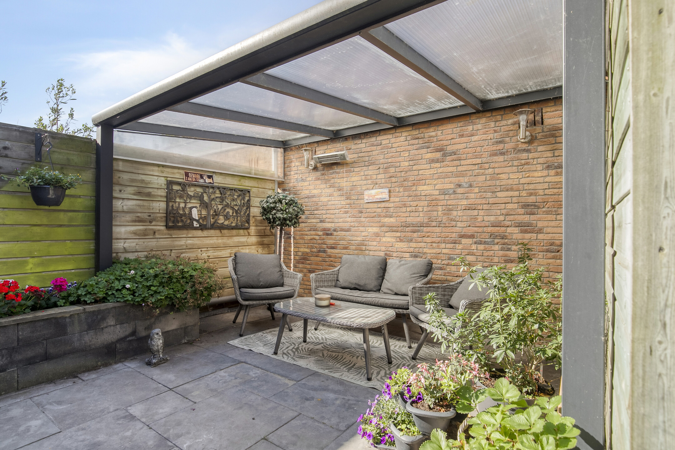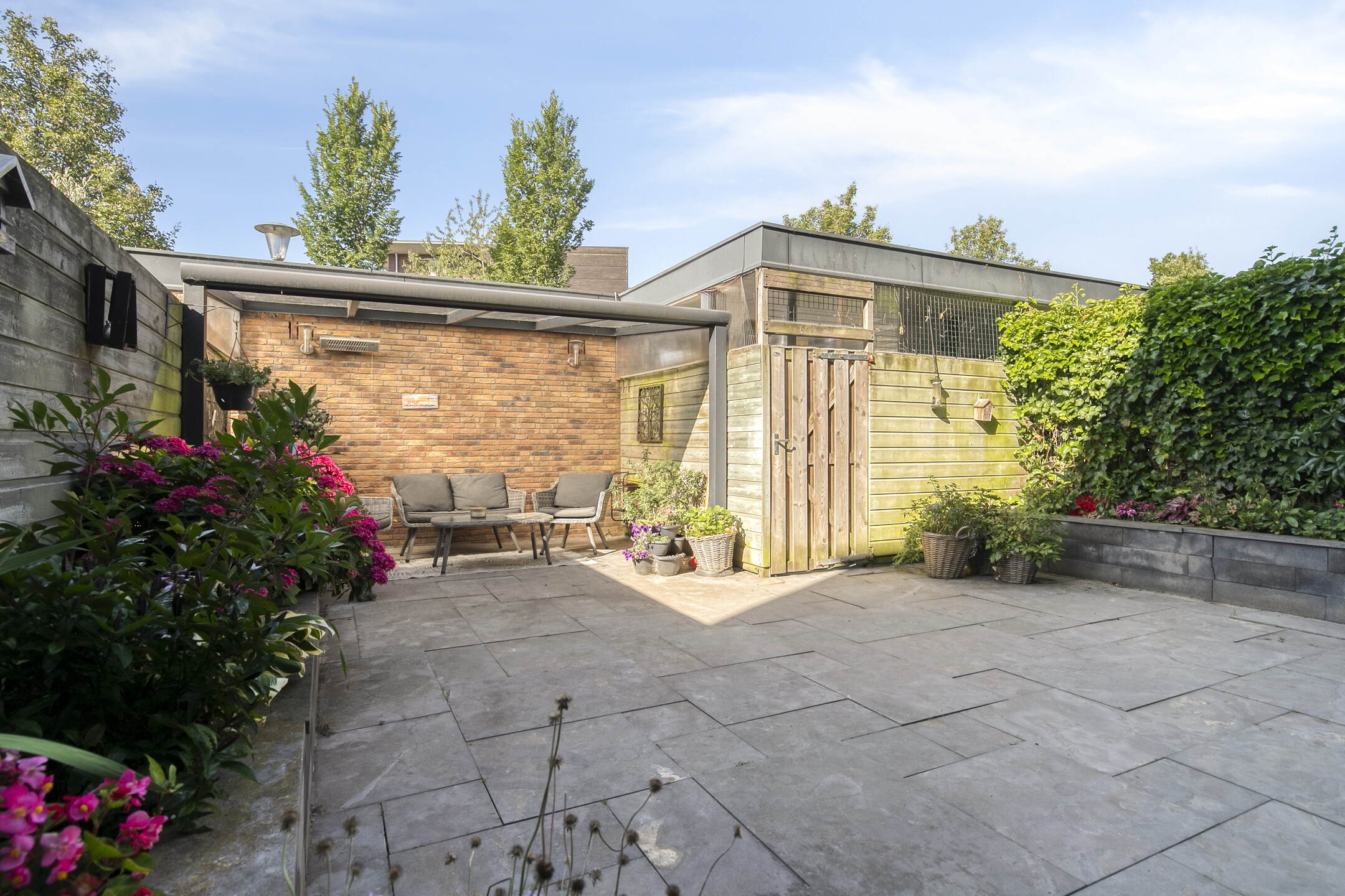 Deze zonnige tuin is op het zuiden gelegen en heeft diverse zitplekjes en plantenperken. Ook is er een elektrisch zonnescherm aanwezig. Achterin de tuin bevindt zich de berging en overkapping: ideale plek om tot in de late uurtjes buiten te vertoeven. Naast de berging kun je op eigen terrein een auto parkeren.