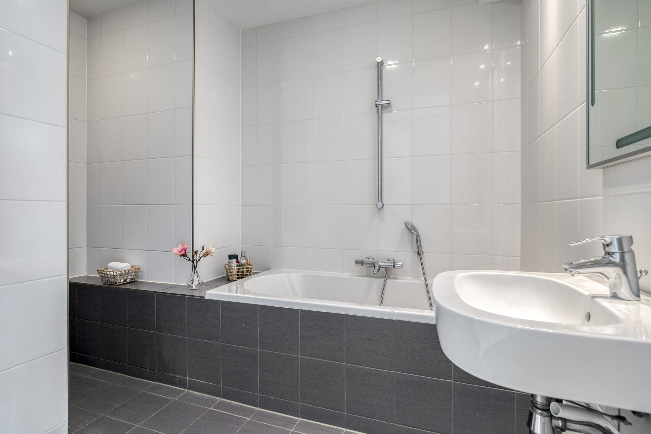 De badkamer beschikt over een ligbad, douche en handdoekradiator.