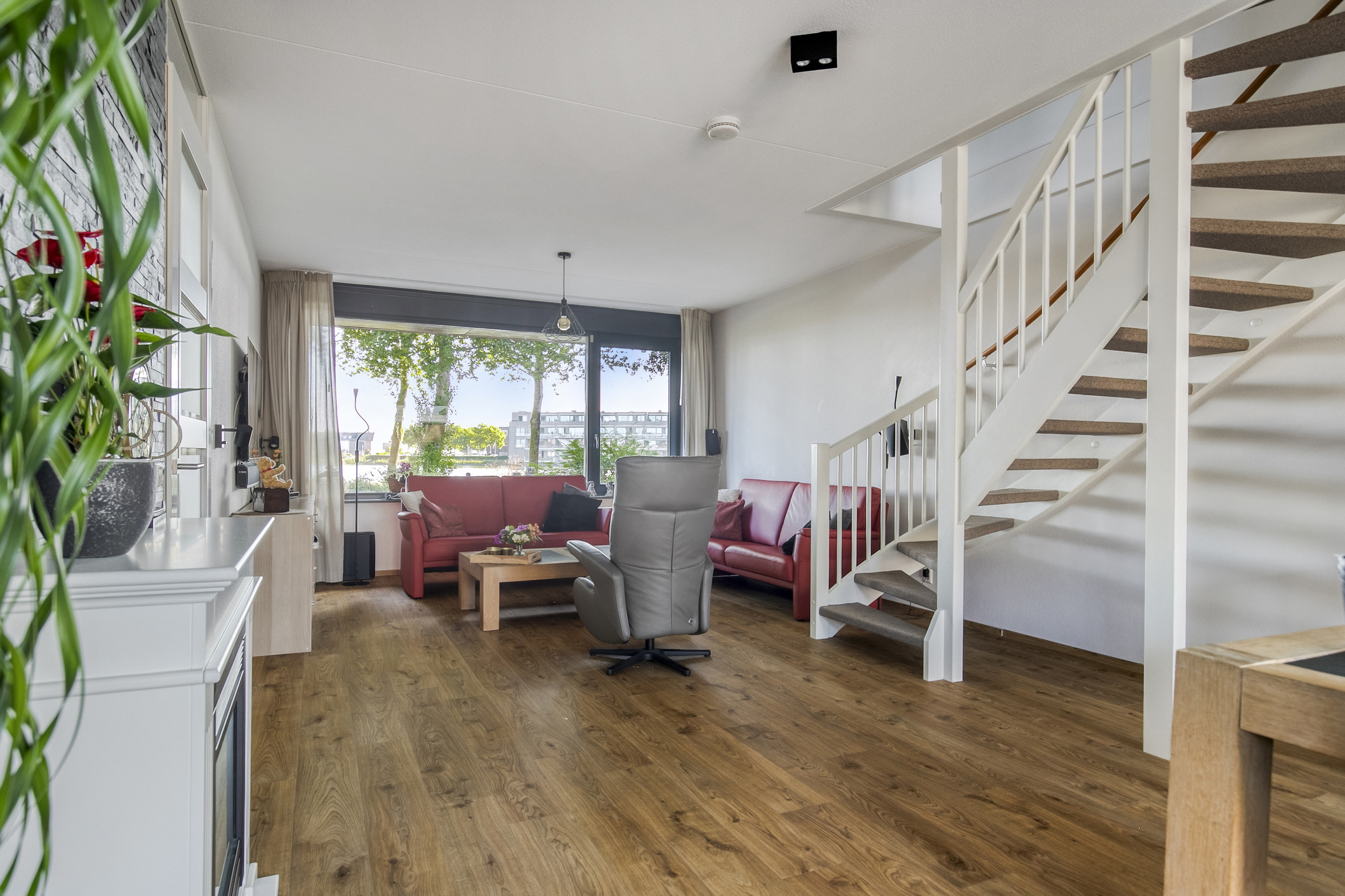 De ruime en lichte woonkamer is voorzien van een nette pvc vloer met vloerverwarming en biedt een prachtig vrij uitzicht over het water. Aan de achterzijde bevindt zich de moderne open keuken met veel opbergruimte en inbouwapparatuur, waaronder een vaatwasser, spoelbak met heetwaterkraan, inductiekookplaat, afzuigkap, koelkast, vriezer, combi-oven en oven.