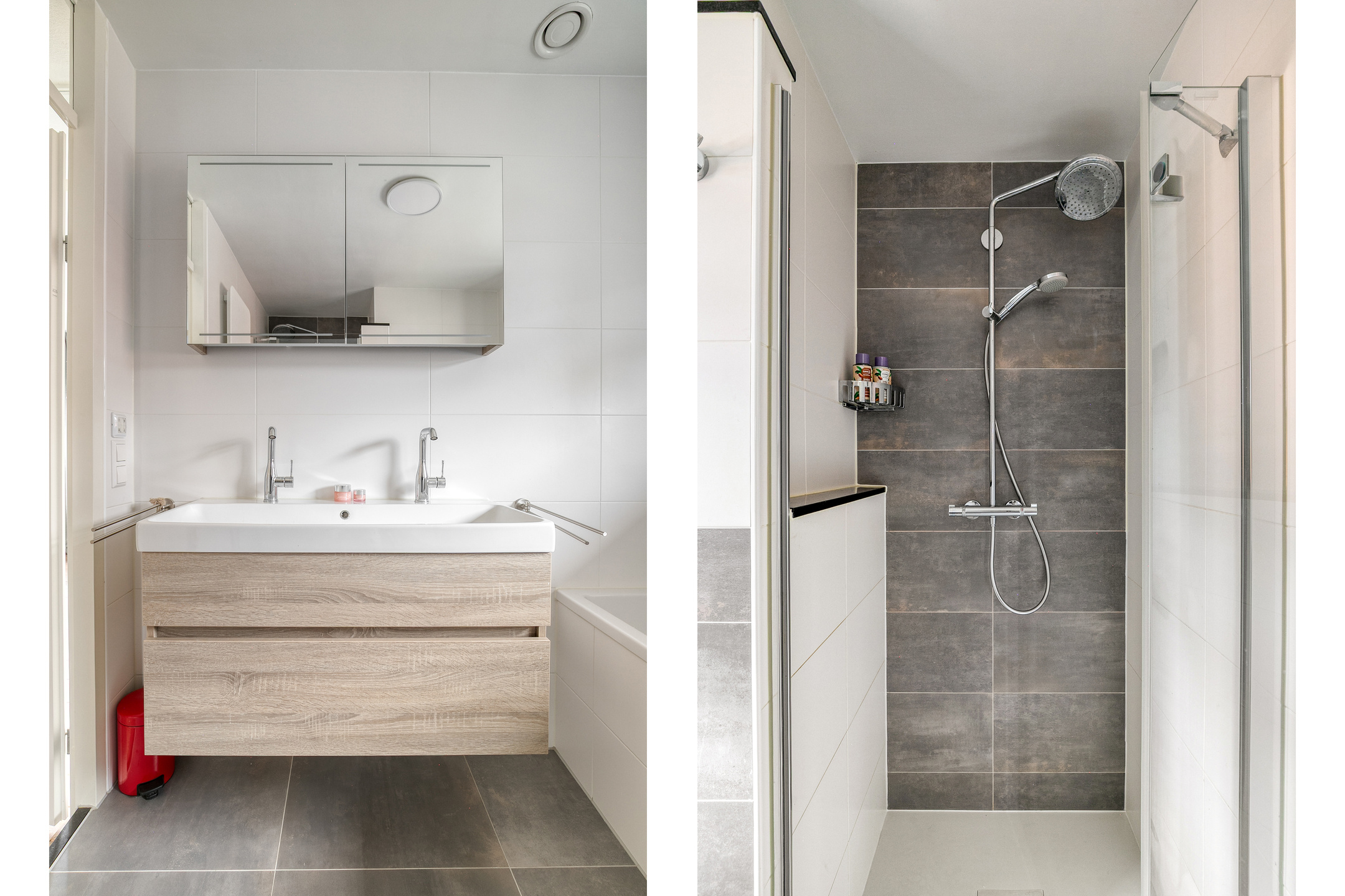 De moderne badkamer is uitgerust met een ligbad, dubbele wastafel, toilet en douche.