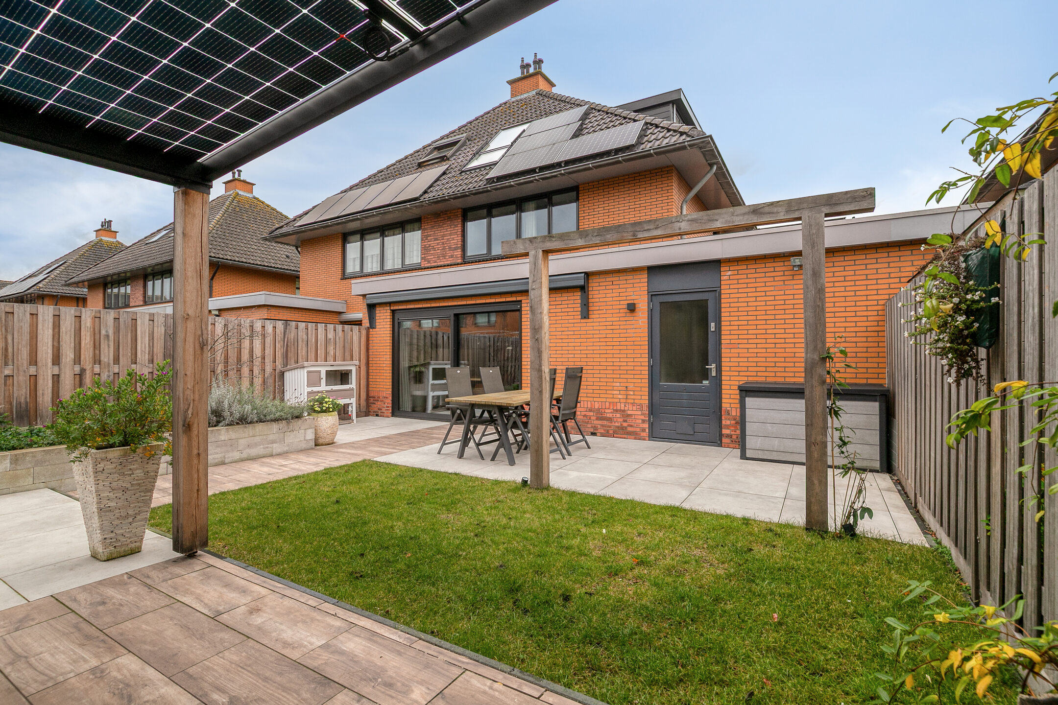 Via de aluminium schuifpui bereik je de achtertuin, uitgerust met een elektrisch zonnescherm.